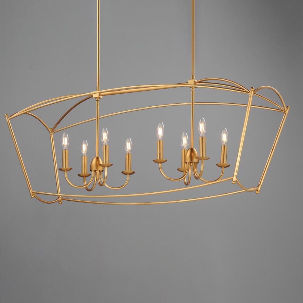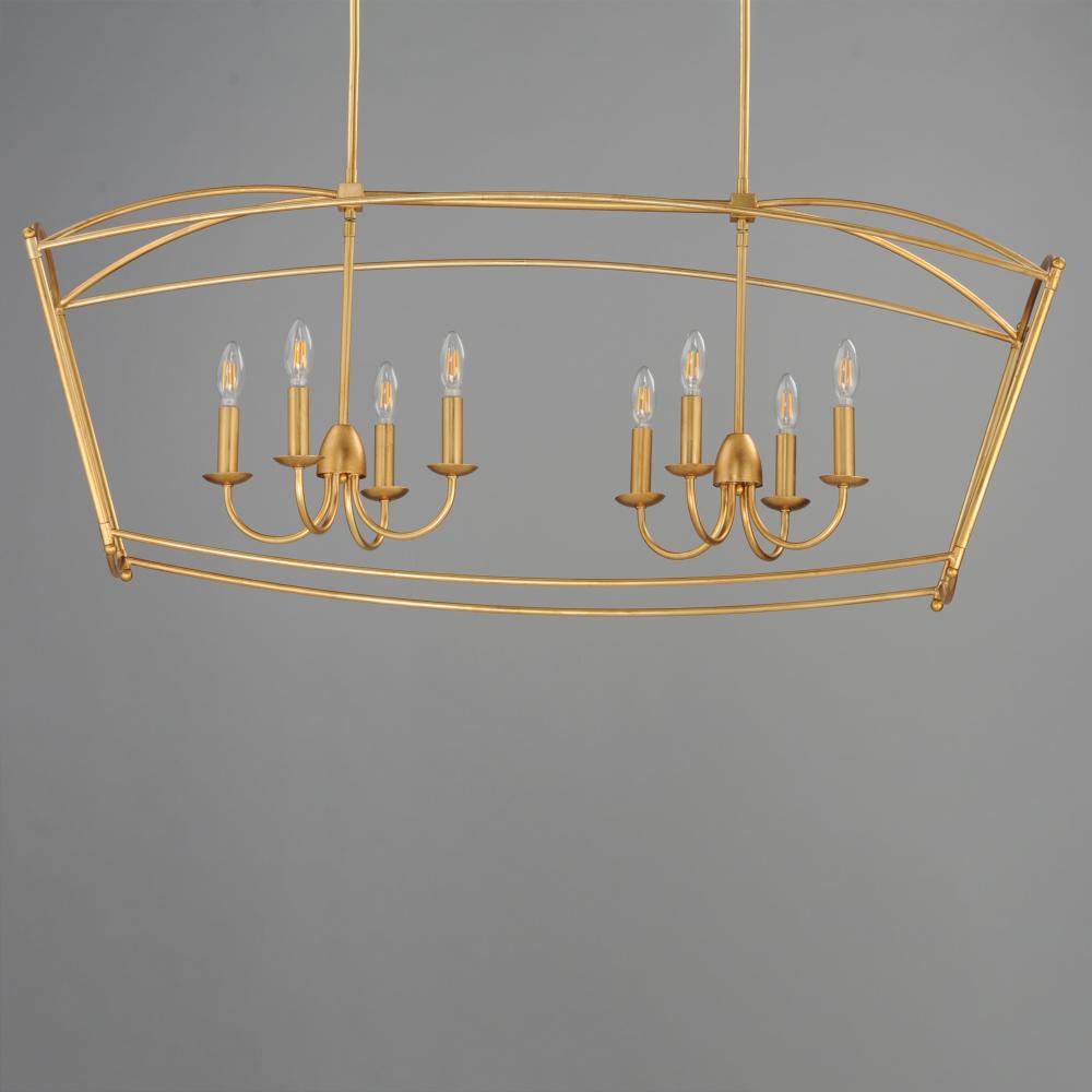 Sweeping metal accents links create classic curves on a minimalist chandelier. Available in hand-rubbed Chestnut Bronze or elegant Gold Leaf finishes. Add crystal accents to elevate the design for a more extravagant glamour. The design manages to evoke Fre