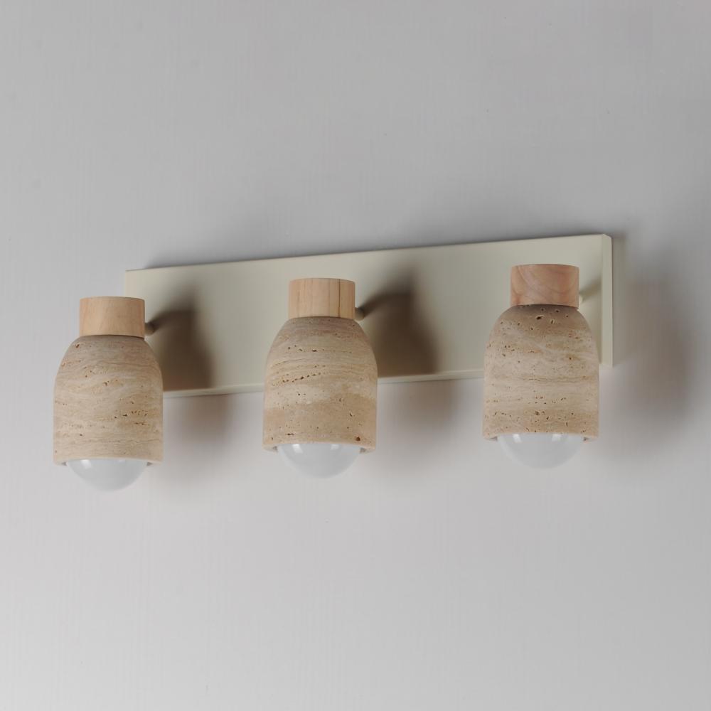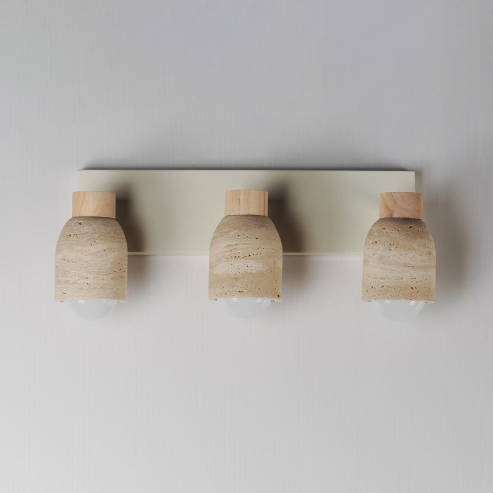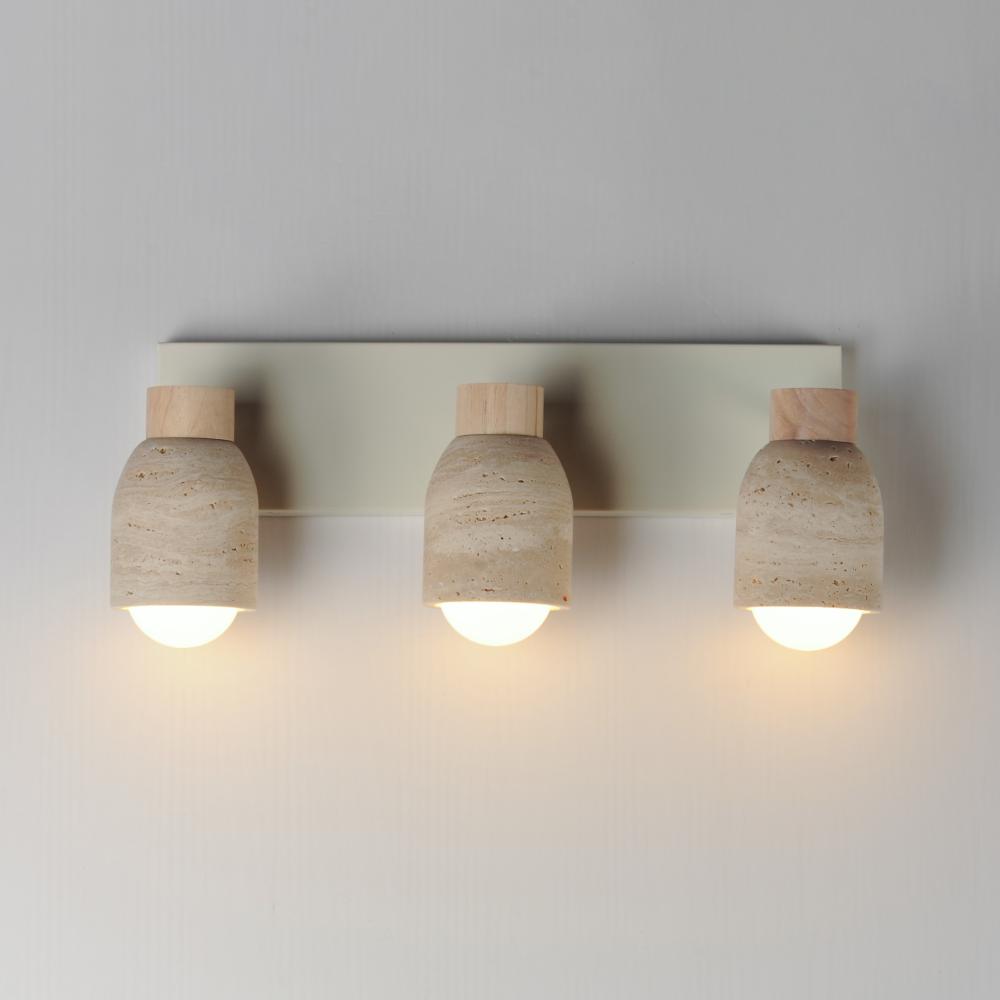 A tribute of natural materials, this collection features carved stone shades in your choice of Travertine or volcanic Lava Rock, paired with coordinating lathed wood bases. The Travertine composition showcases White Oak wood and Ecru white metal accents, w