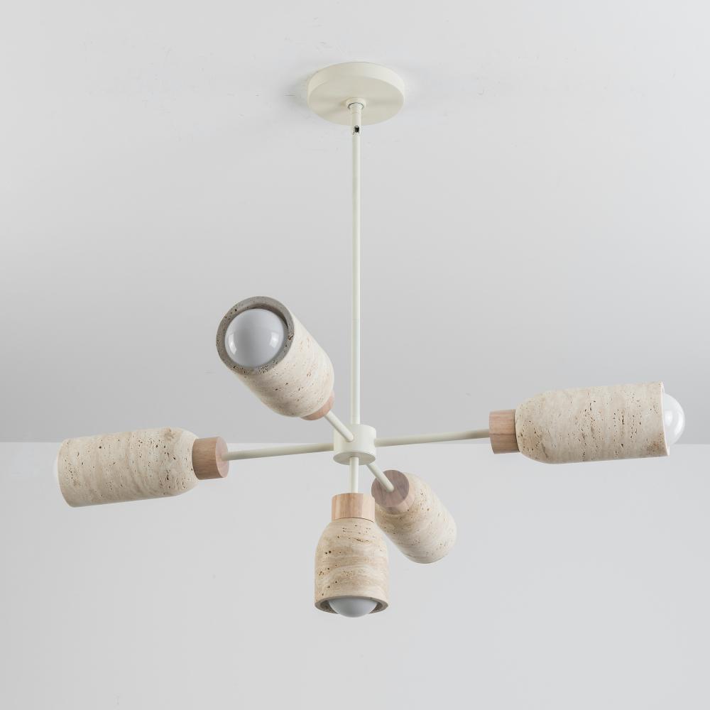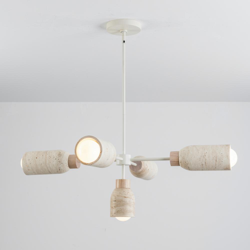 A tribute of natural materials, this collection features carved stone shades in your choice of Travertine or volcanic Lava Rock, paired with coordinating lathed wood bases. The Travertine composition showcases White Oak wood and Ecru white metal accents, w