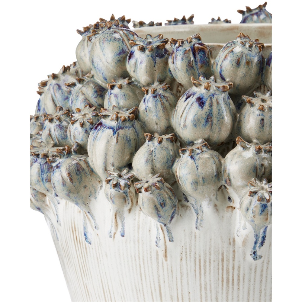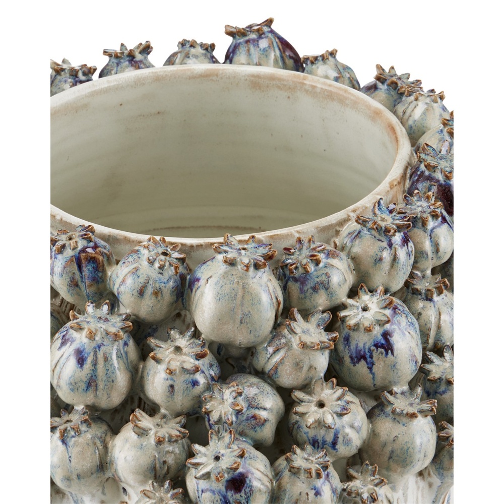 The Poppy Pod Crown Large Vase is made of ceramic glazed in a mix of ivory and reactive blue and purple. The pods that circle the crown of the ivory vase are fashioned and put in place by hand in a painstaking process. Then the reactive glazing is dripped on them.