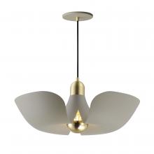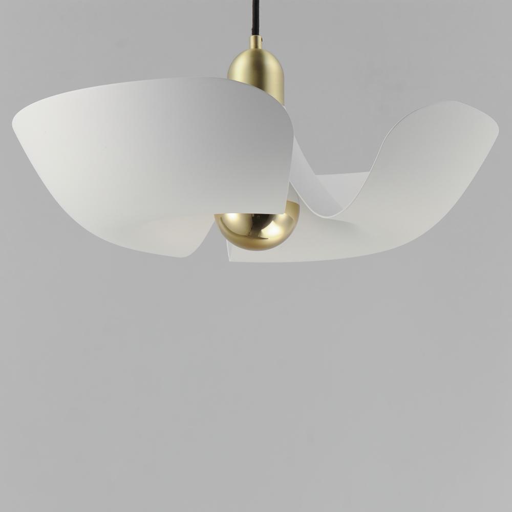 Incurved metal petals of Storm Grey or White finish with Satin Brass caps make oversized biophilic light fixtures. Available as wall sconces or pendants, the various configurations provide playful forms both nostalgic or youthful. Pair with a white G25 lam
