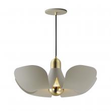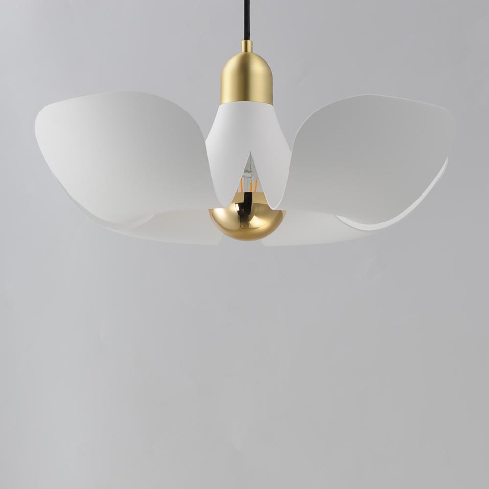 Incurved metal petals of Storm Grey or White finish with Satin Brass caps make oversized biophilic light fixtures. Available as wall sconces or pendants, the various configurations provide playful forms both nostalgic or youthful. Pair with a white G25 lam