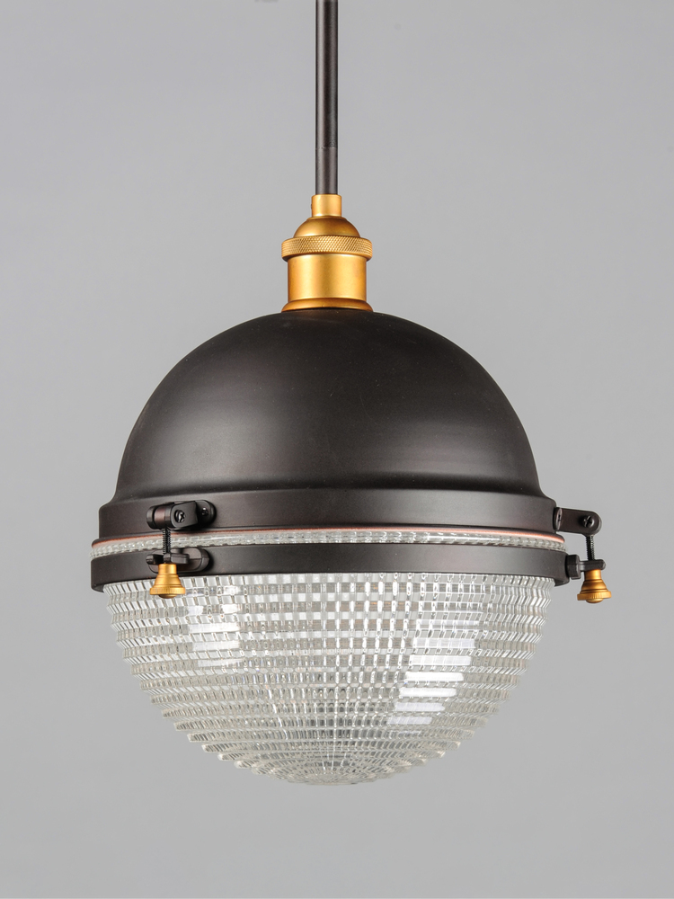 This nautical design features a solid dome of aluminum finished in Oil Rubbed Bronze with solid brass hardware finished in Antique Brass. The Clear prismatic glass diffuser completes the authentic look of this outdoor collection.