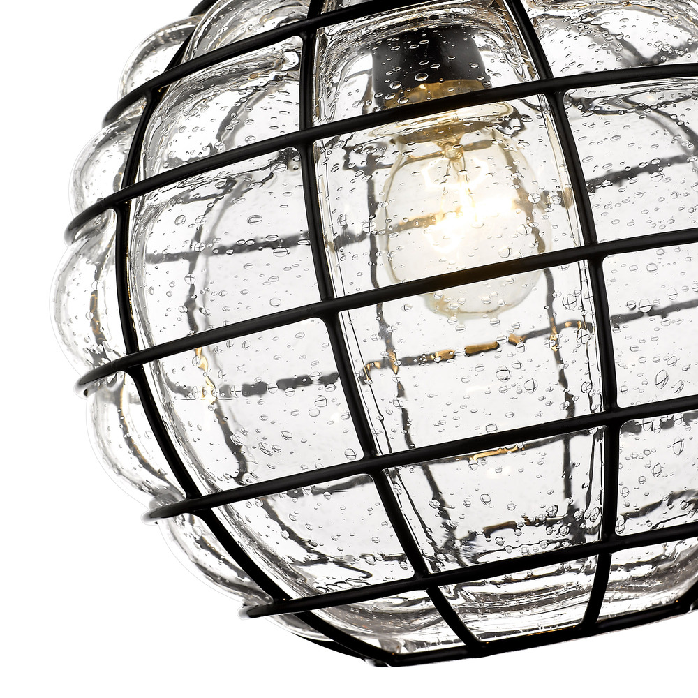 Powell is a collection of lovely glass and metal pendants. The decorative, mixed materials of the shades are the focus of these contemporary fixtures. To allow the shades to take center stage, the remaining matte black hardware is kept simple by design. Composed of curved iron, the shade?s metal ribbing forms an elongated sphere. Open at the bottom and handblown by artisans, the structured glass has an industrial-modern feel. During the blowing process, hot, molten glass pours through each crevice creating raised bubbles along the surface. As it cools, the seeded glass clings to the grid-like metal cage. When lit, the gently diffused shades have a unique glow. Beckoning onlookers, these lights add visual interest anywhere they hang.