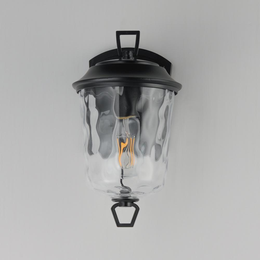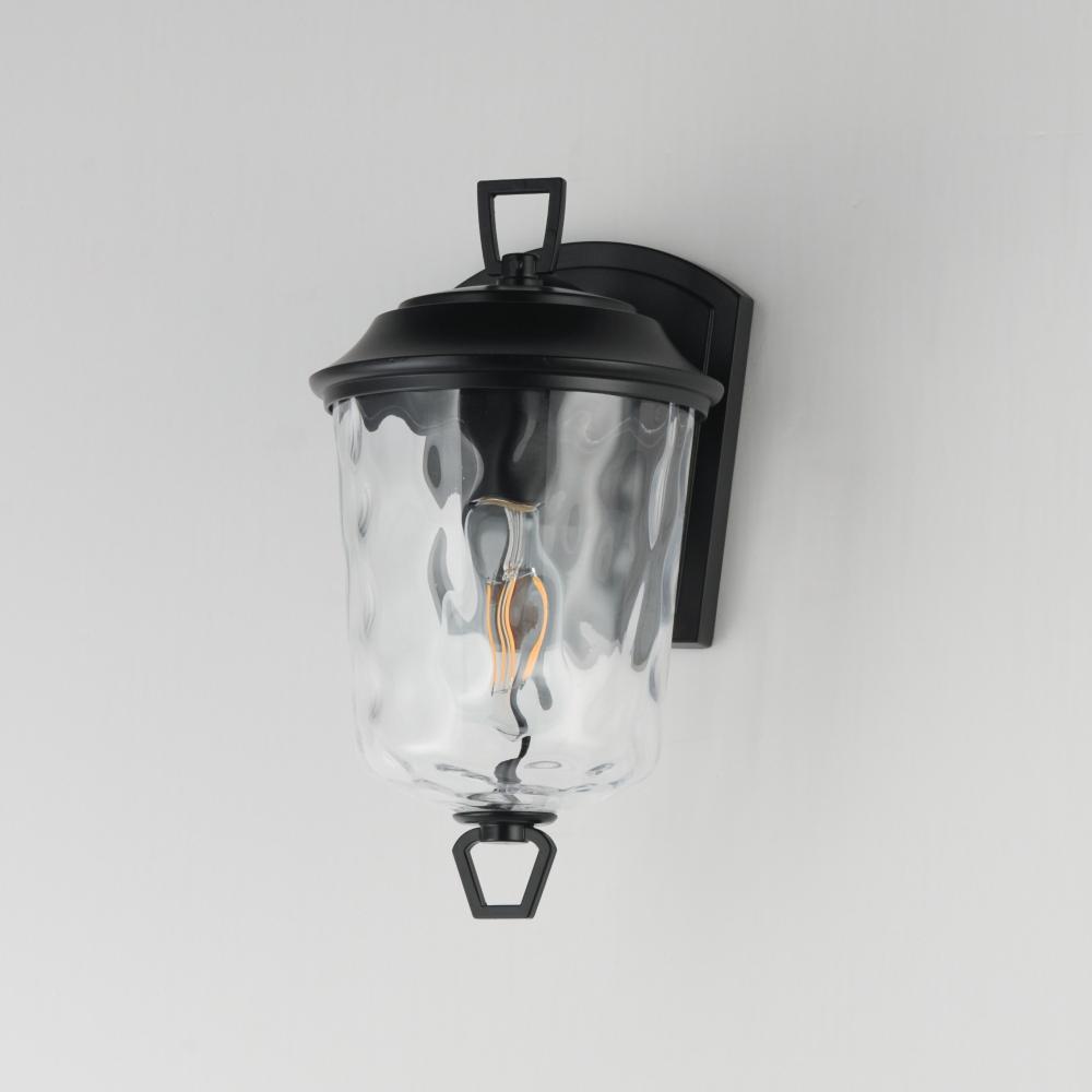 The Prescott collection of outdoor lanterns reimagines a classic design with timeless elegance. Crafted with a durable die-cast aluminum frame and finished in a sleek Matte Black, these lanterns exude a refined, understated charm. The water glass shade cre