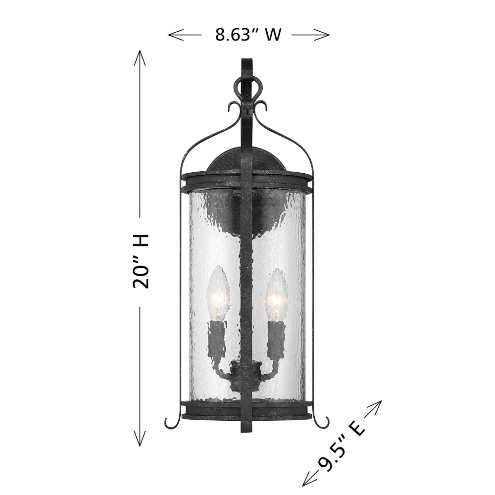 The Savoy House Preston 2-light outdoor wall sconce blends traditional form with textural nuance. Panes of clear pebbled glass shimmer inside an elongated silhouette adorned with graceful detailing, including a shepherd’s hook accent. The distressed Iron Oxide finish adds dimension and character. Preston is 20" tall, 8.63" wide, and extends 9.5" from the wall. Uses two candelabra size bulbs of up to 60 watts each (bulbs not included). Wet area rated.