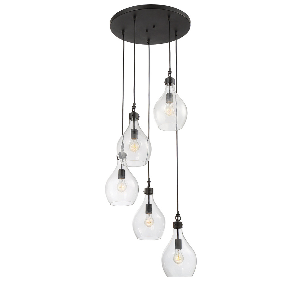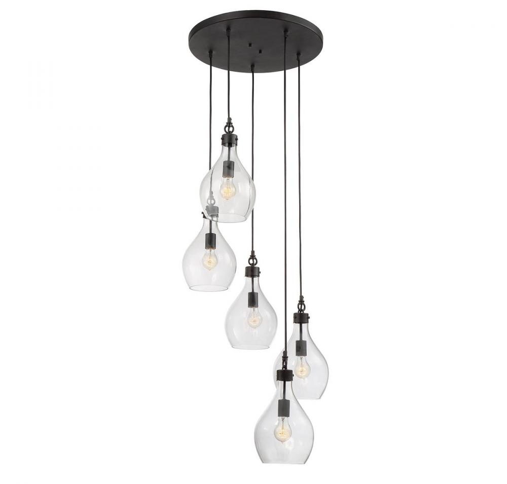 Bold lines and graceful curves create the understated design of this Pulaski chandelier. A sleek, round ceiling plate suspends five, ring-fitted glass shades at graduated heights, forming a wonderful cascade appearance. The frame has a rich, oiled bronze finish, and the five shades are lovely, large bulbous, bottle shapes, made of pristine, clear glass. Five 60W, E-style bulbs provide excellent illumination through the clear glass —using Edison or visible filament bulbs will add even more character and charm. This chandelier is 23” wide and 13.5” high: perfect for classic style in your dining room, kitchen, living room, family room, foyer, bar, great room, bedroom, office, or gaming room.