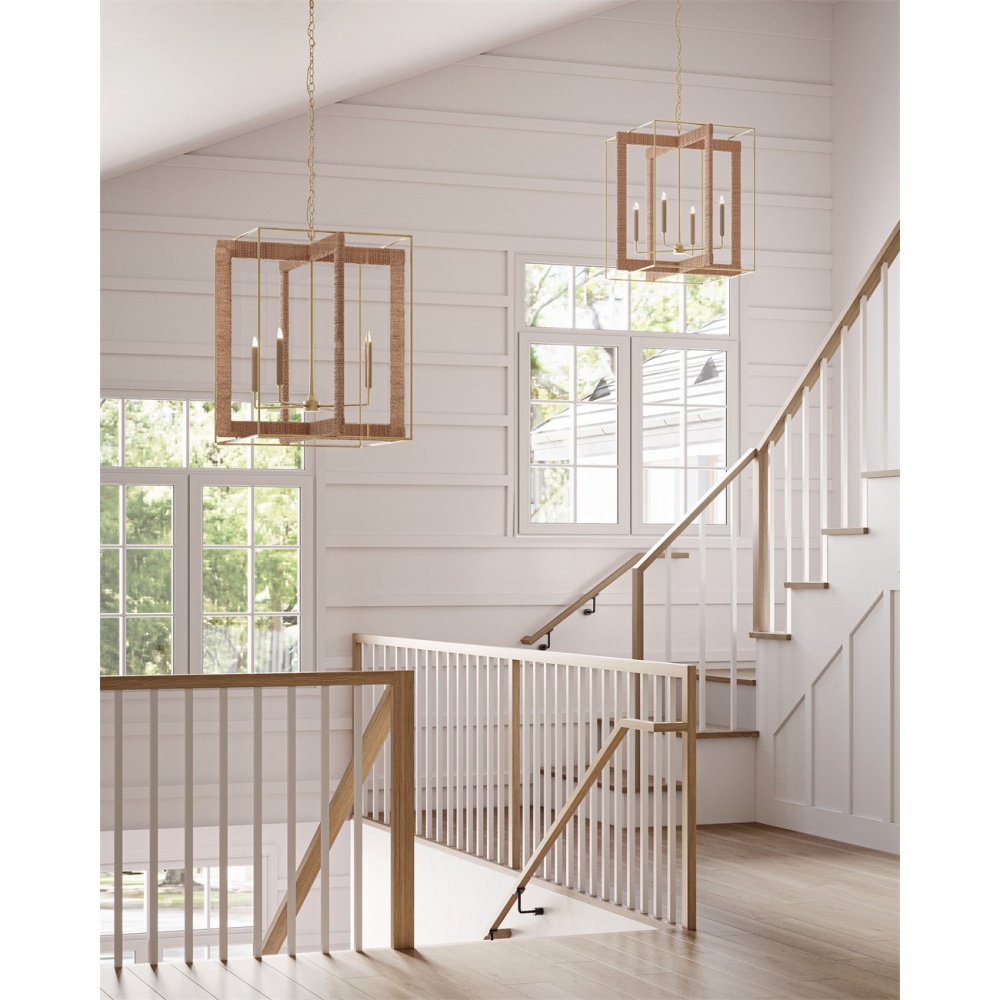 Design notes that make the Purebred Chandelier special are its modern boxy shapes, its thin metal bands in a contemporary gold leaf finish that contrast wider ones wrapped in Abaca rope, and the care with which the rope has been painstakingly wrapped around the metal. Adjustable from 43" to 110" with use of included chain/rod kit/cable. If your space calls for a longer drop, additional chain/rods/cable is available for purchase.
