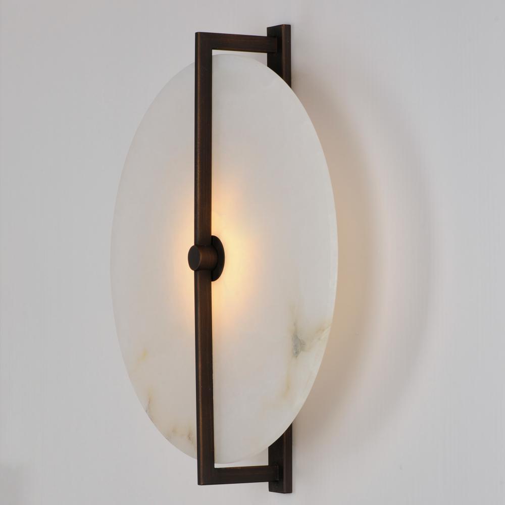 Modern in execution, the Quarry collection features natural Spanish alabaster in an iron frame finished in Darkened Bronze or Natural Aged Brass. Dedicated LED housing shine light on alabaster panels, highlighting the stone's beautiful, veined characte
