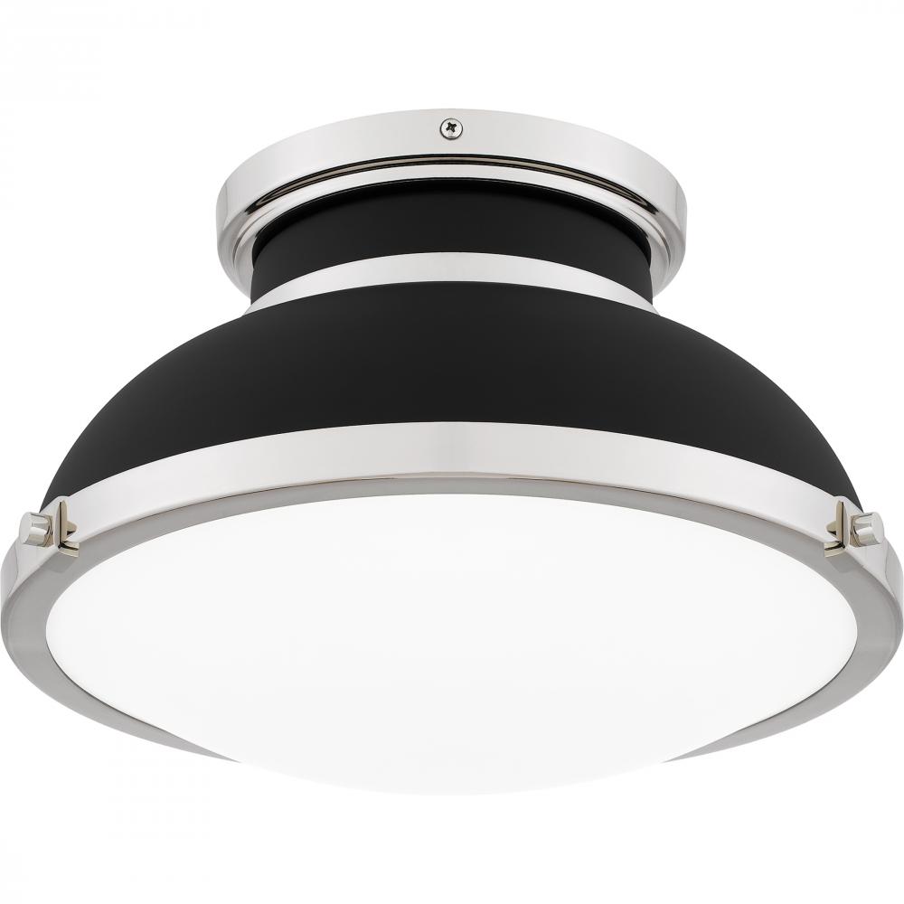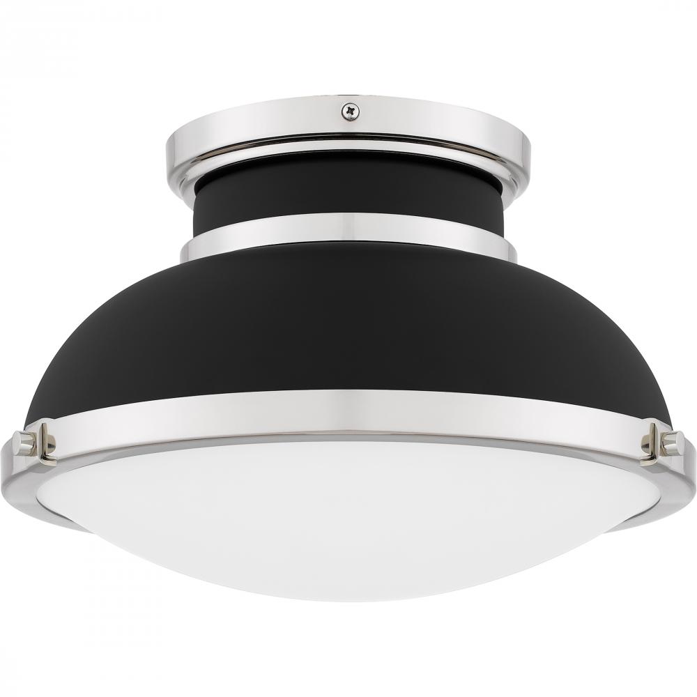 A classic design with industrial style elements, Tobias is a true standout piece in any room. The flush mount ceiling light features a matte black metal shade, accentuated by sleek polished nickel accents for a beautiful and shining contrast. A clear etche