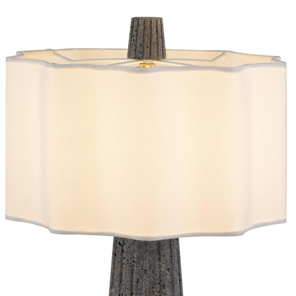 A sculptural beauty with quiet strength, the Gio Table Lamp pairs bold design with soft elegance. Its fluted travertine base in matte black offers grounded sophistication, while the uniquely shaped fabric shade casts a gentle, ambient glow—like candlelig