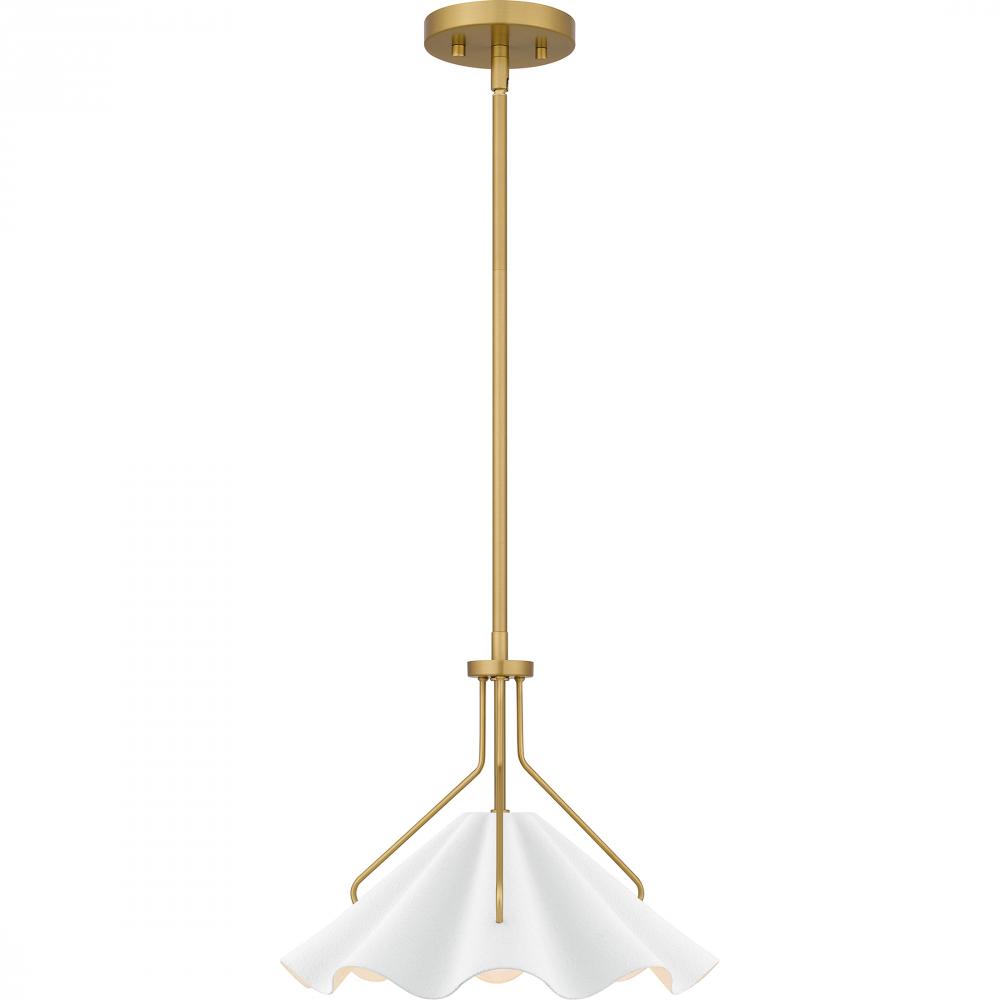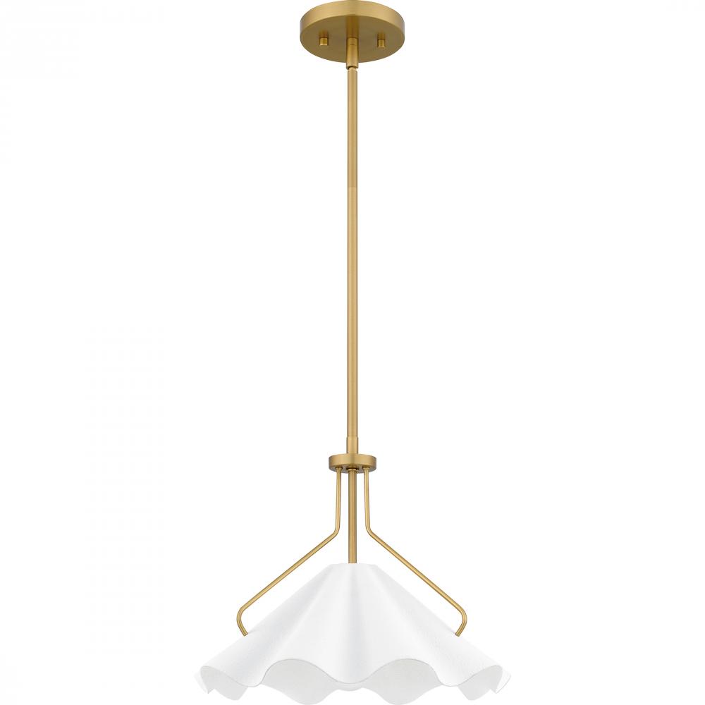 Combining a playful silhouette with modern styling, the Mejia pendant light offers a striking update to any space. The white metal shade featuring a unique swirling design adds drama, while an aged brass finish adds a gold shine. Hung individually or in a