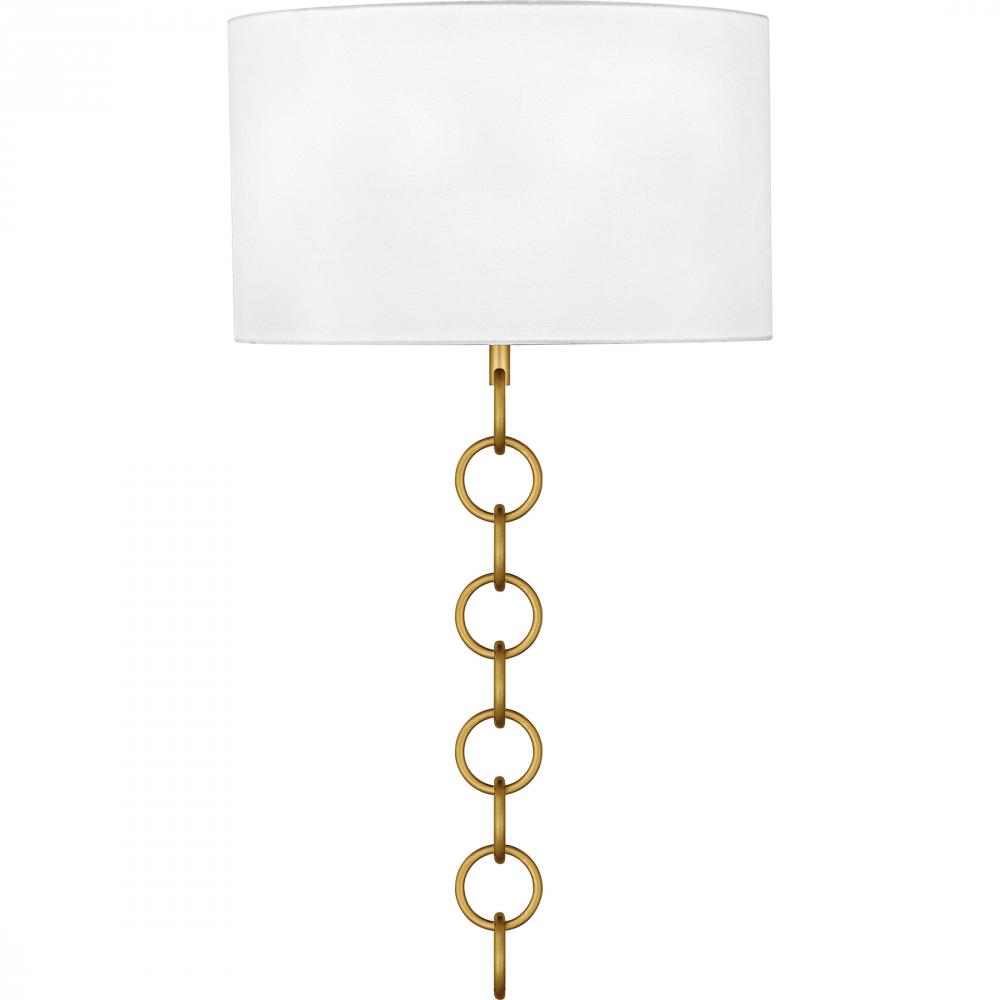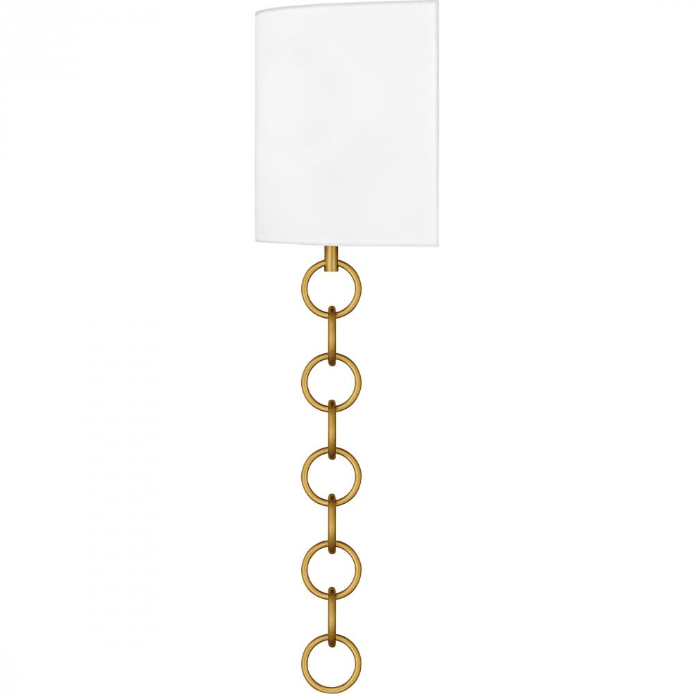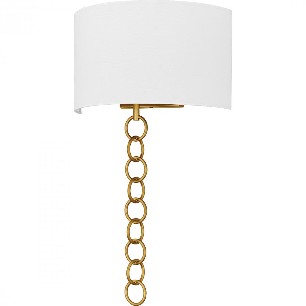 The Baynes wall sconce adds a touch of traditional elegance to any space with its refined design. Featuring a white fabric shade, this sconce provides a soft, ambient light that enhances the warmth and charm of your room. The large chain detail, available
