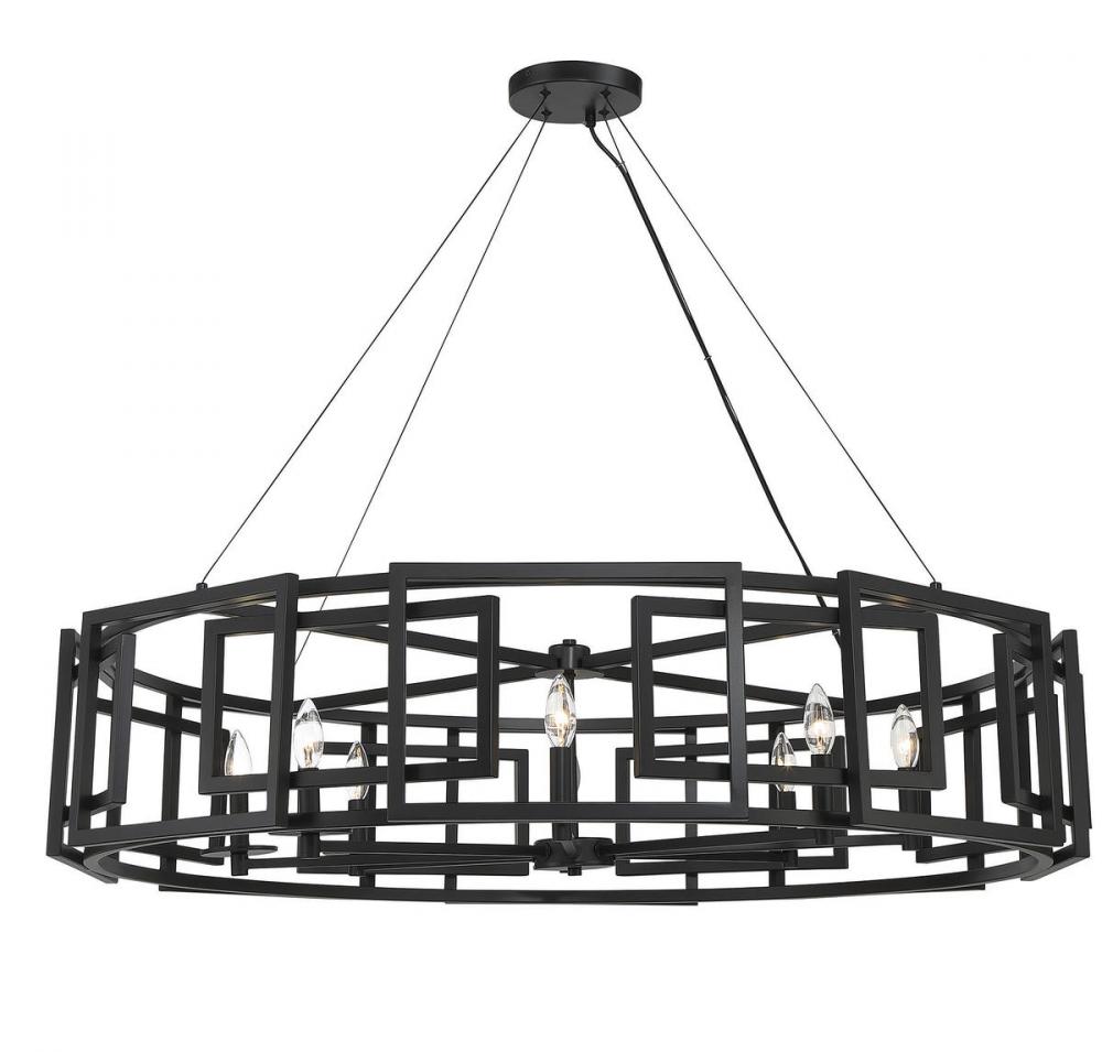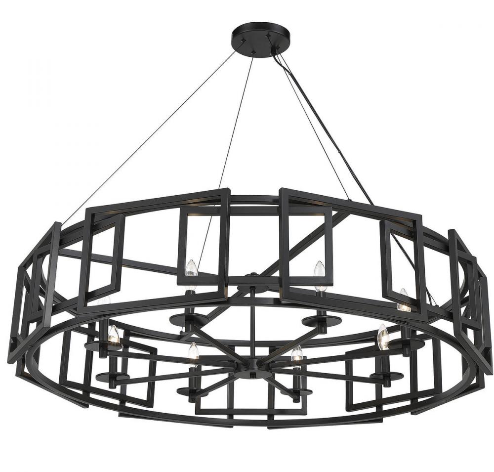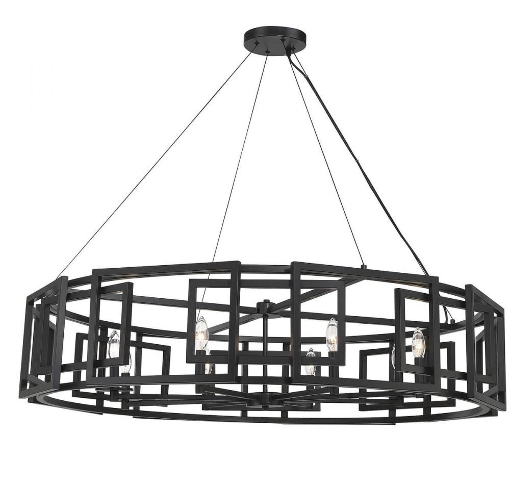 The architectural Savoy House Radcliffe 8-light chandelier showcases a mesmerizing geometric style with two different layers of frames that offset one another, yet still fit together perfectly. At 45" wide and with an adjustable height ranging from 10" to 130", Radcliffe is specially designed for large rooms. Finished in matte black. Uses eight candelabra size bulbs of up to 60 watts per bulb. Comes with 120" of chain.