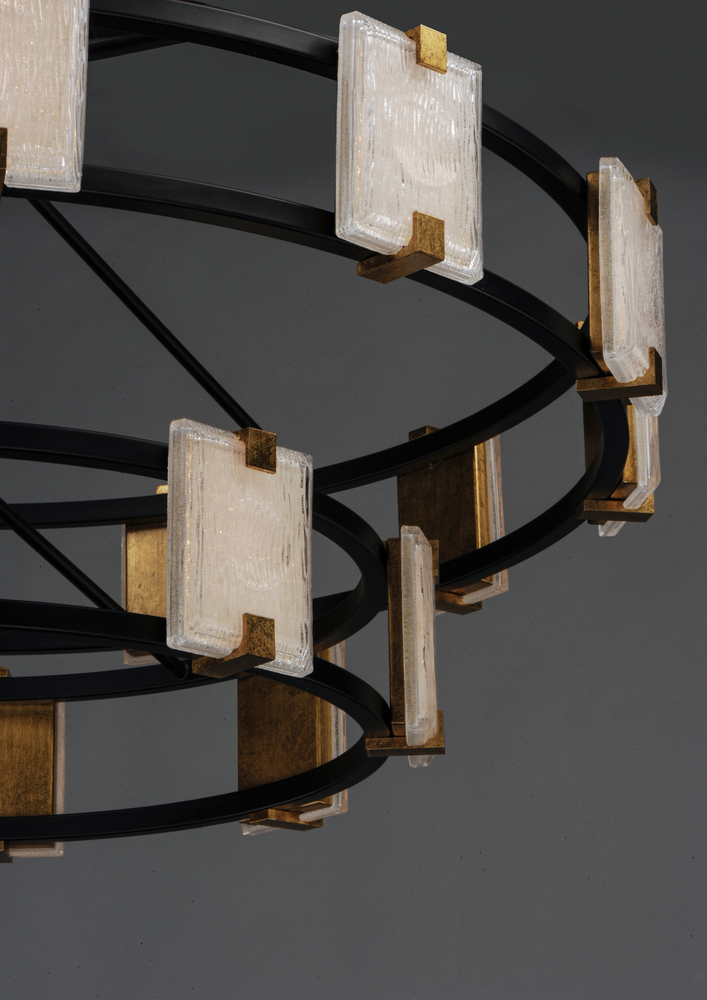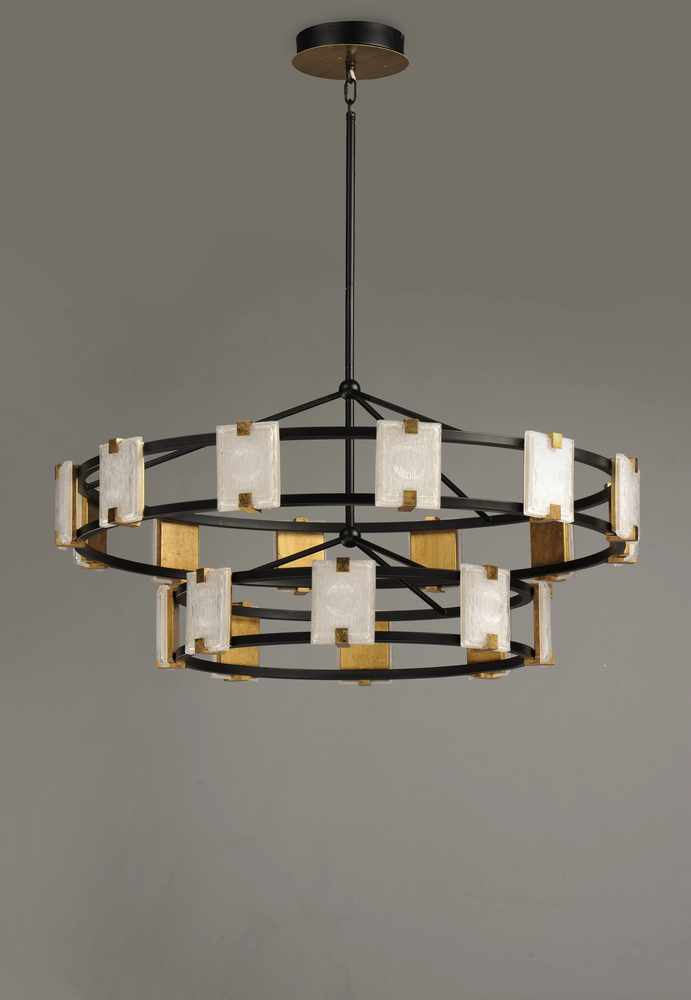 Piastra style glass diffuses integrated LED to shimmer radiantly. Suspended on a Black frame with Gold Leaf accents, this perfect blend of contemporary and traditional design adds glamour to a broad spectrum of design aesthetics.