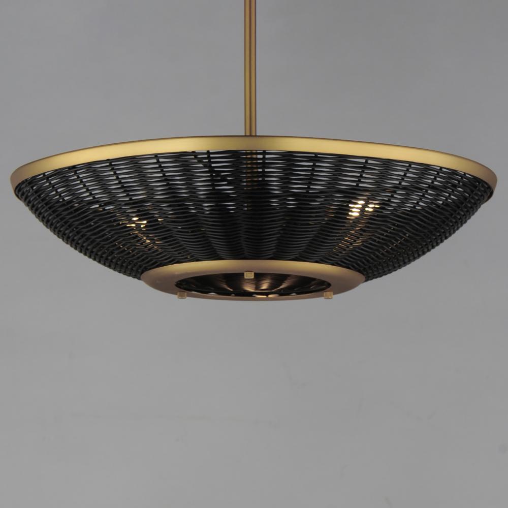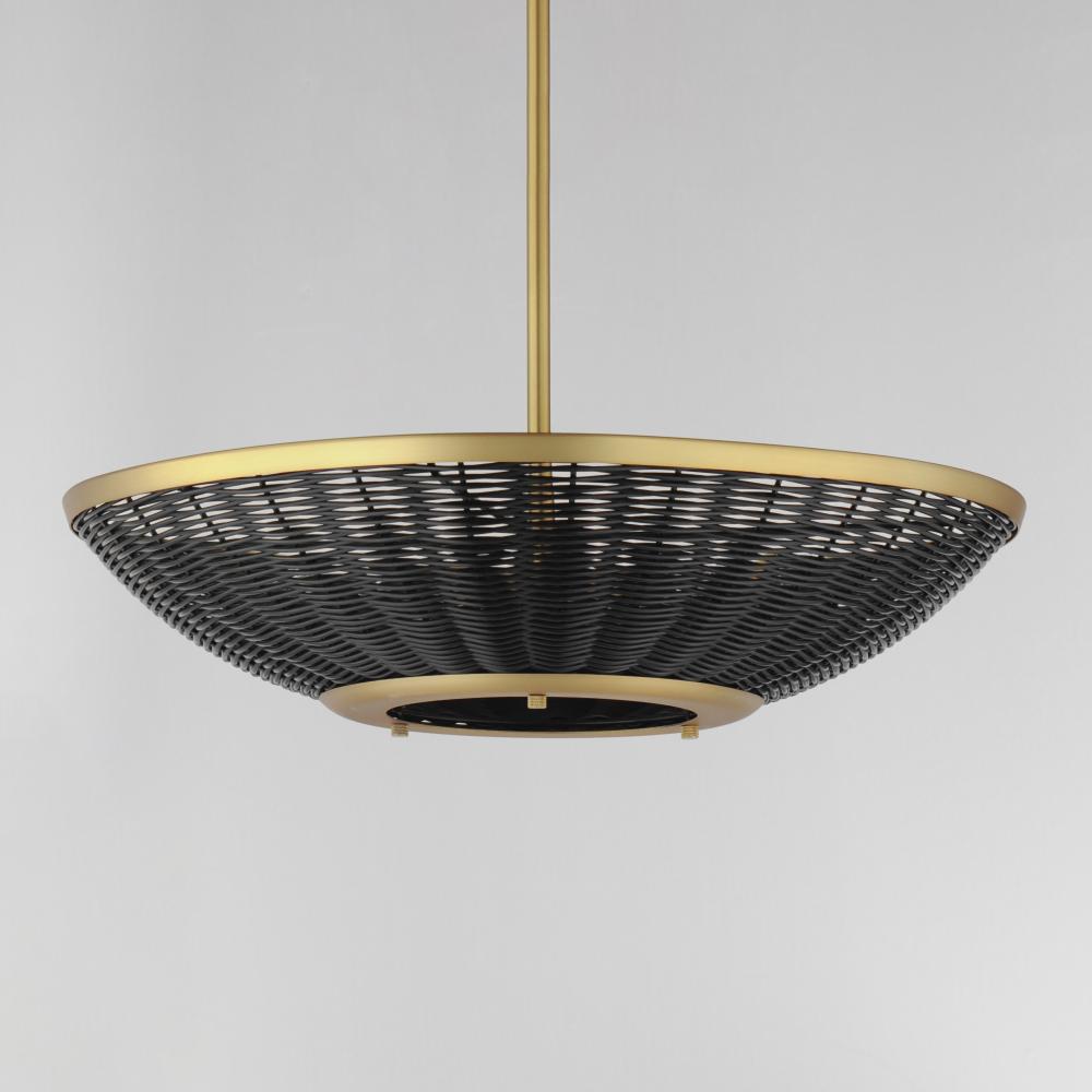 Hand-woven rattan is blackened and configured into a series of pendants and a dual-purpose wall sconce and flush mount. The blackened rattan is contrasted by a frame in Natural Aged Brass that adds a dramatic styling to the natural material. The overall ef
