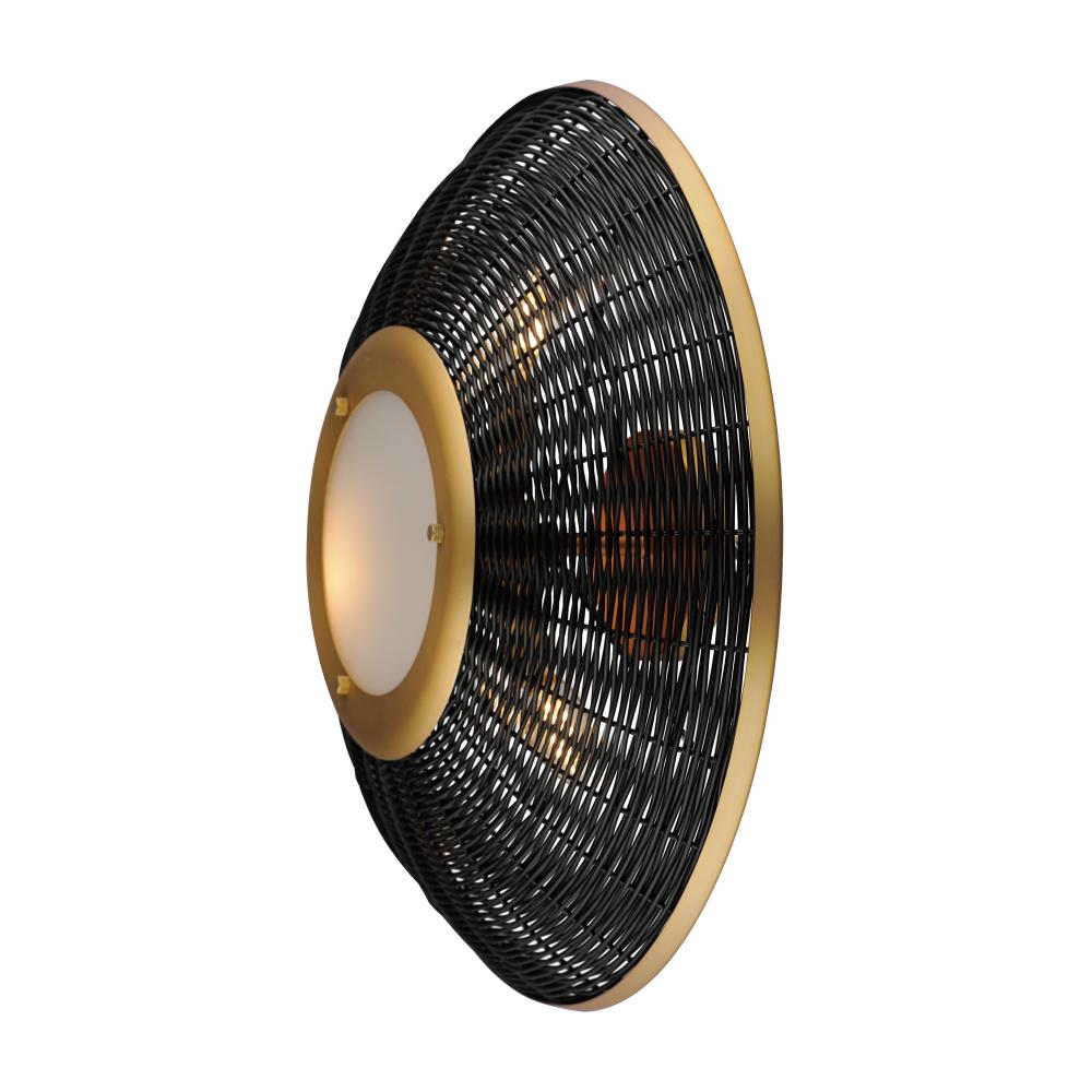 Hand-woven rattan is blackened and configured into a series of pendants and a dual-purpose wall sconce and flush mount. The blackened rattan is contrasted by a frame in Natural Aged Brass that adds a dramatic styling to the natural material. The overall ef