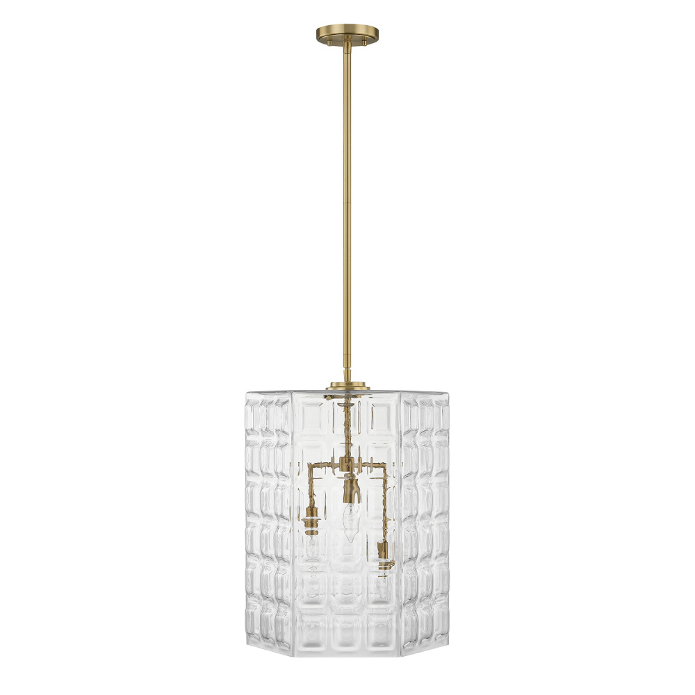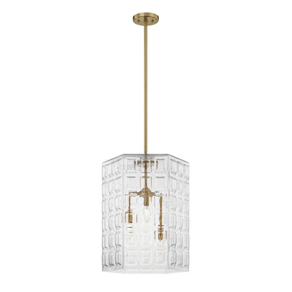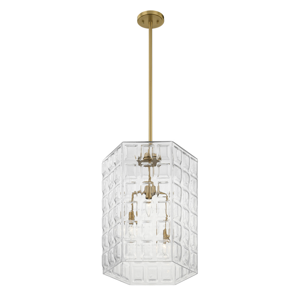 The Savoy House Reddick 3-light pendant brings striking geometry and shimmering drama into your home. Panes of deeply textured, molded geometric glass form a bold hexagon and the three interior lights are staggered at varying heights to amplify visual intrigue. A Warm Brass finish wraps the entire design in modern sophistication, making Reddick an unforgettable focal point. It is 21.75" in height and 16" in width. It uses three candelabra size bulbs of up to 60 watts per bulb. Bulbs not included. Comes with four 12" downrods and one 6" downrod.