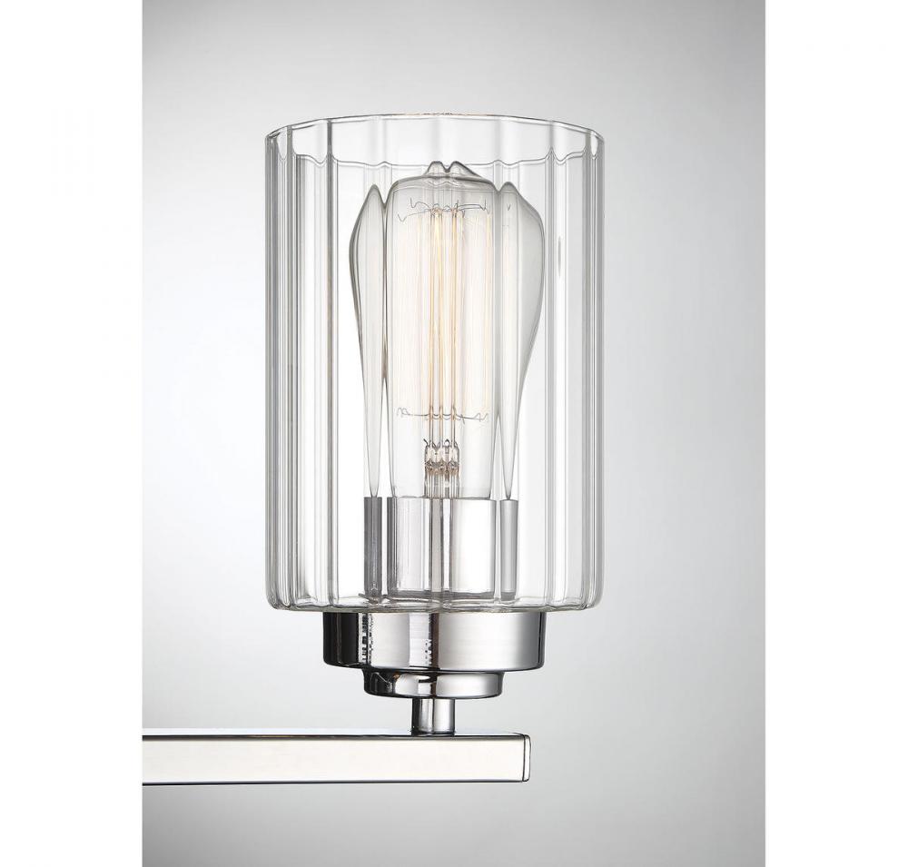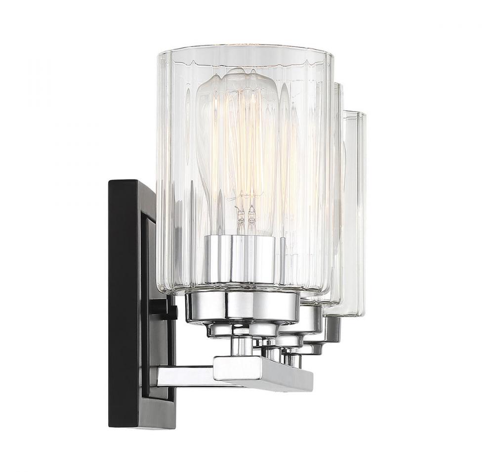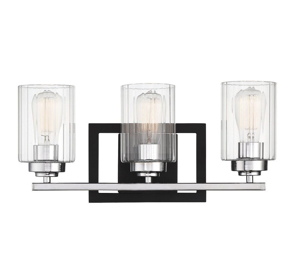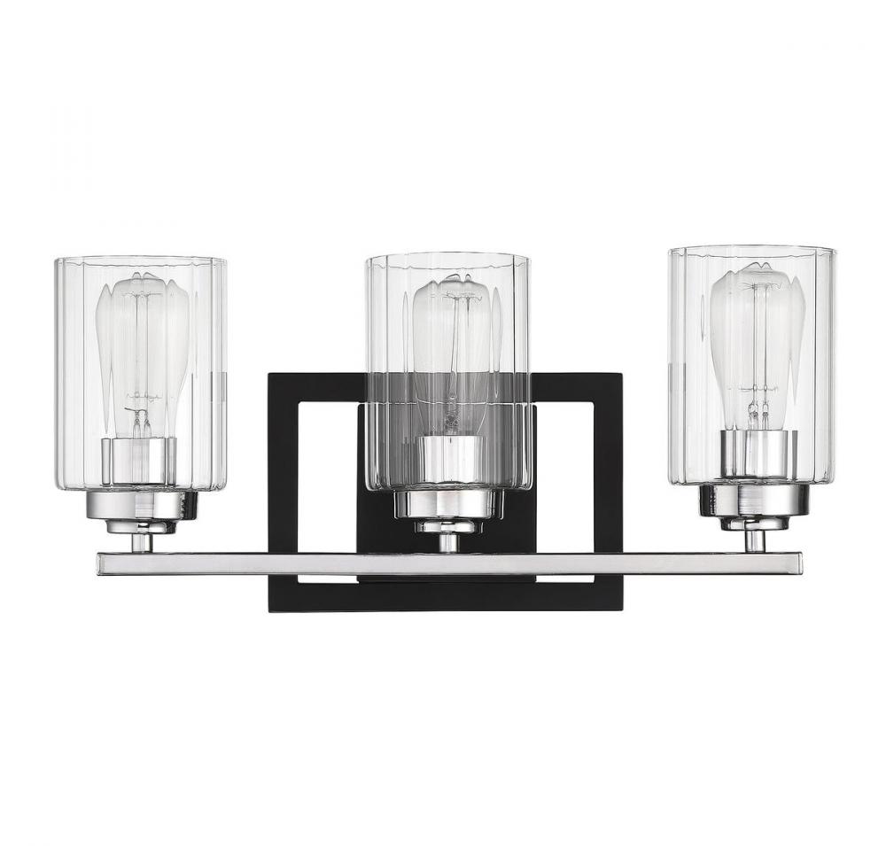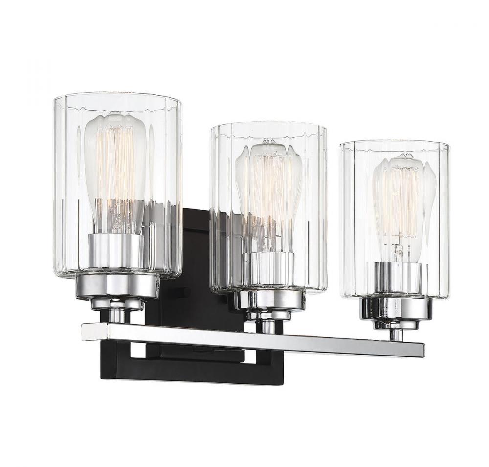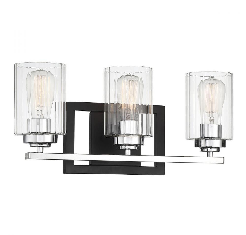 Clean, sophisticated lines and superior finishes make this Savoy House Redmond 3-light bath bar the epitome of today’s classic style. The matte black rectangles of the backplate make a bold statement and polished chrome accents add to the brilliant presentation. Clear ribbed glass shades emphasize the lines, add texture and allow the light to fill your space. This gorgeous fixture will feel right at home with multiple design aesthetics, including modern farmhouse, contemporary, transitional and industrial-inspired decor. It measures 20" wide by 9.25" high and holds three 60W standard size bulbs. Redmond is reversible, so you can mount it as uplight or downlight as you see fit. Perfect in your bathroom, powder room or dressing area.