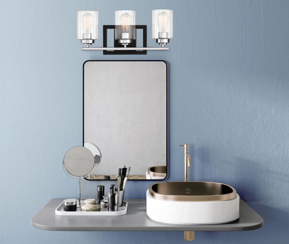 Clean, sophisticated lines and superior finishes make this Redmond bath bar the epitome of today’s classic style. The matte black rectangles of the backplate make a bold statement. Polished chrome accents add to the brilliant presentation. Clear, ribbed glass shades emphasize the lines, add texture, and allow the light to fill your space. This gorgeous fixture will feel right at home with multiple design aesthetics, including modern farmhouse, contemporary, transitional, and industrial-inspired decor. It measures 20” wide by 9.25” high and holds three 60W E-style bulbs. And this stylish Redmond is reversible so you can mount it as uplight or downlight, as you see fit. Perfect in your bathroom, powder room, or dressing area.