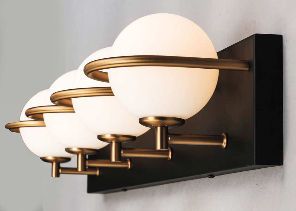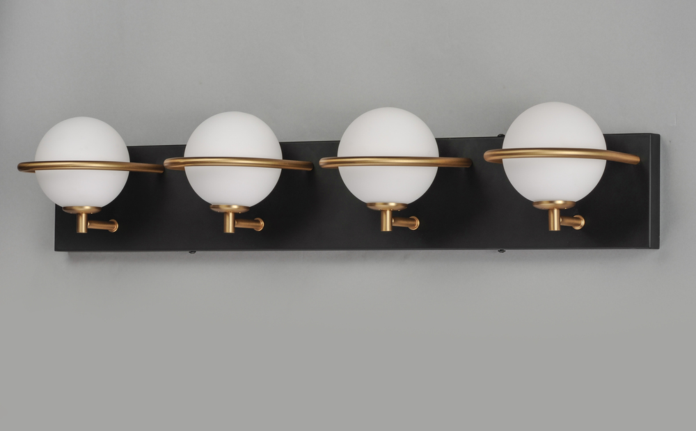 Satin White glass globes are nested behind rings of Gold which dramatically contrasts against the Black metal background. A bedside single sconce features a slim on/off rocker switch that adds convenience to the stylish design. Soft and natural light is pr