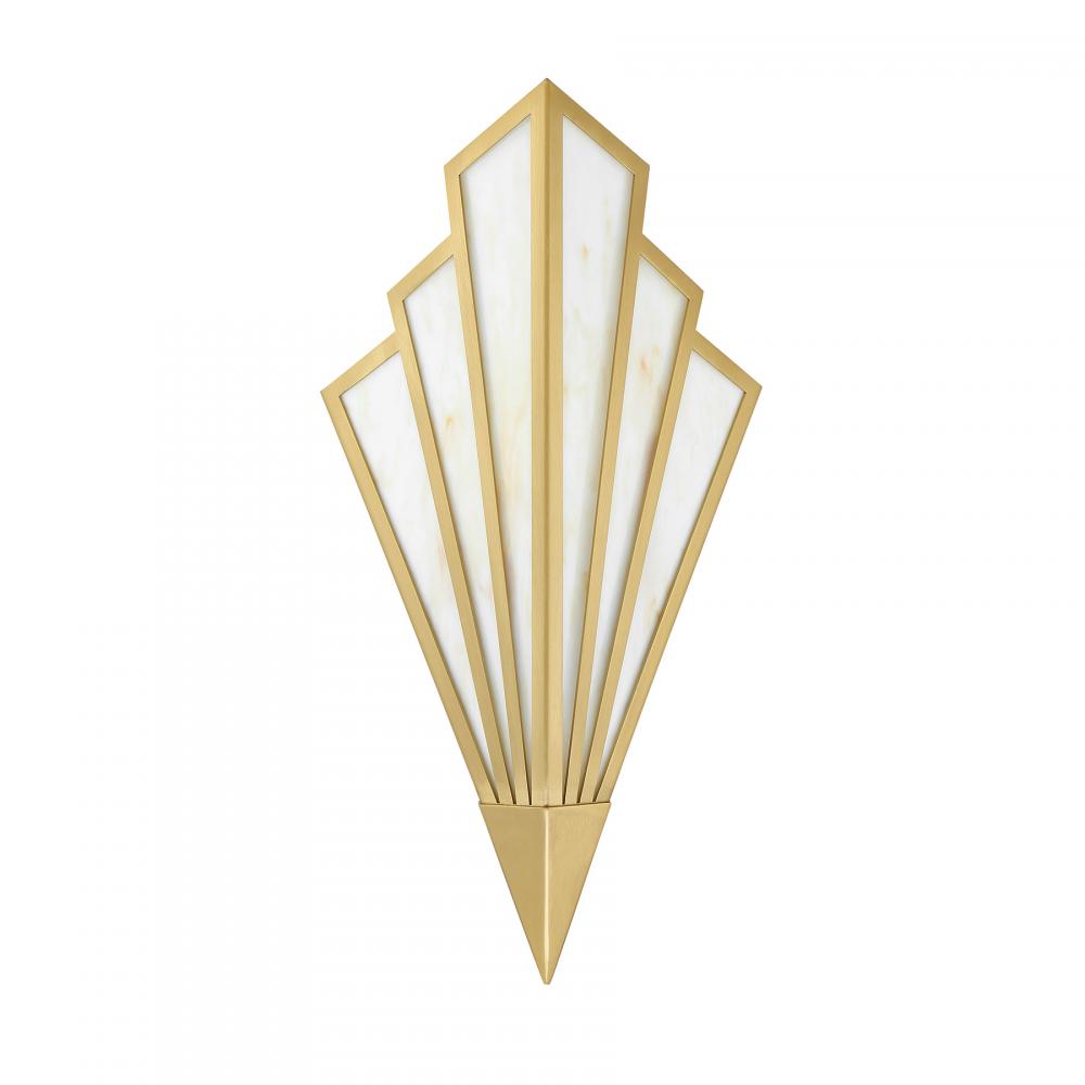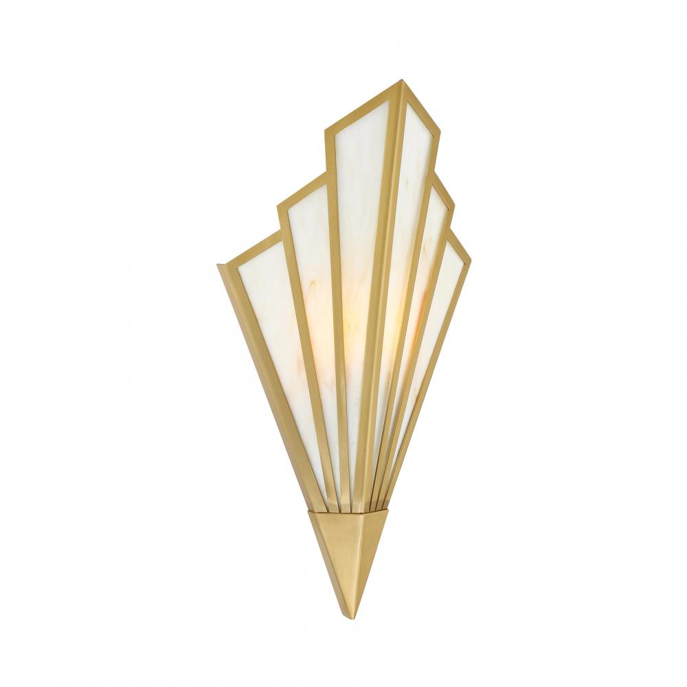 Bring a touch of Art Deco glamour to any space with the chic Savoy House Rivage 1-light sconce. Its fan-like structure is decorated with panes of beautiful Tiffany art glass and finished in Warm Brass. Use it alone or in groupings for timeless allure. Rivage is 18" in height, 8.75" in width and extends 5.5" from the wall. Uses an integrated LED light source. This sconce is damp area rated.