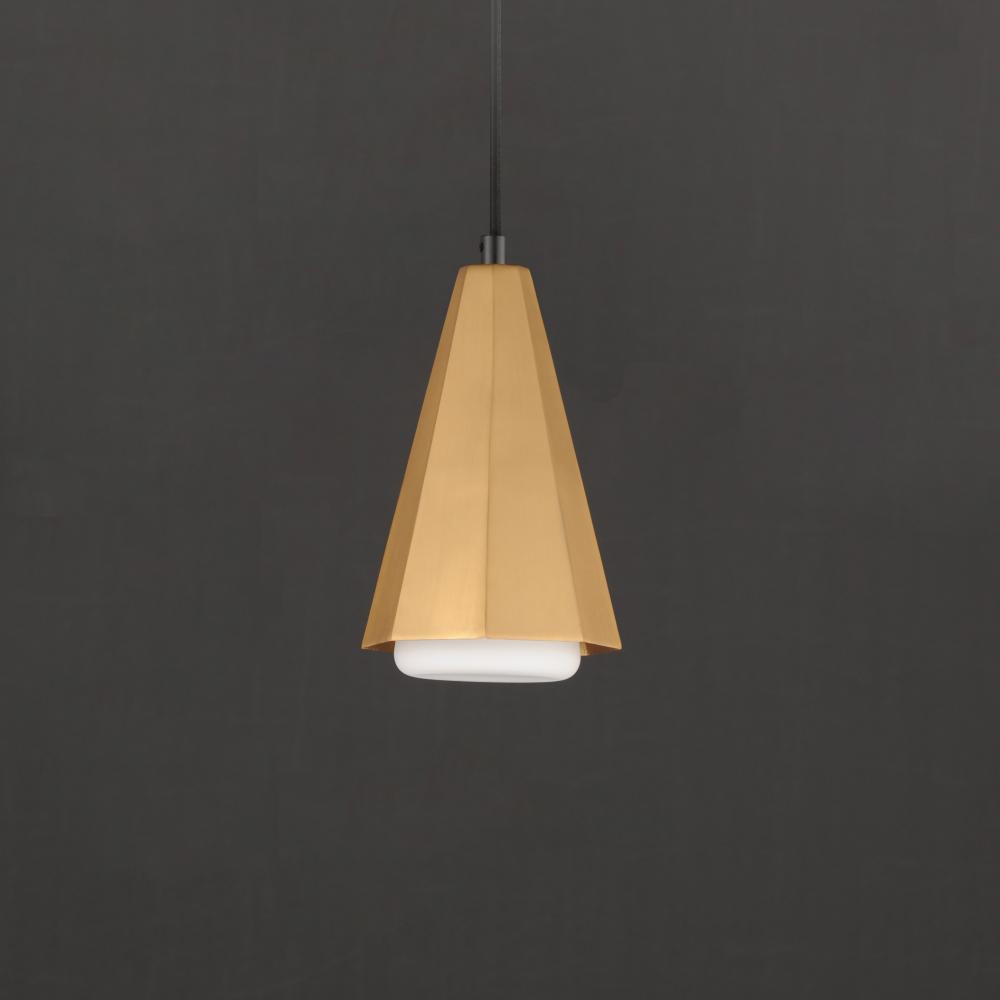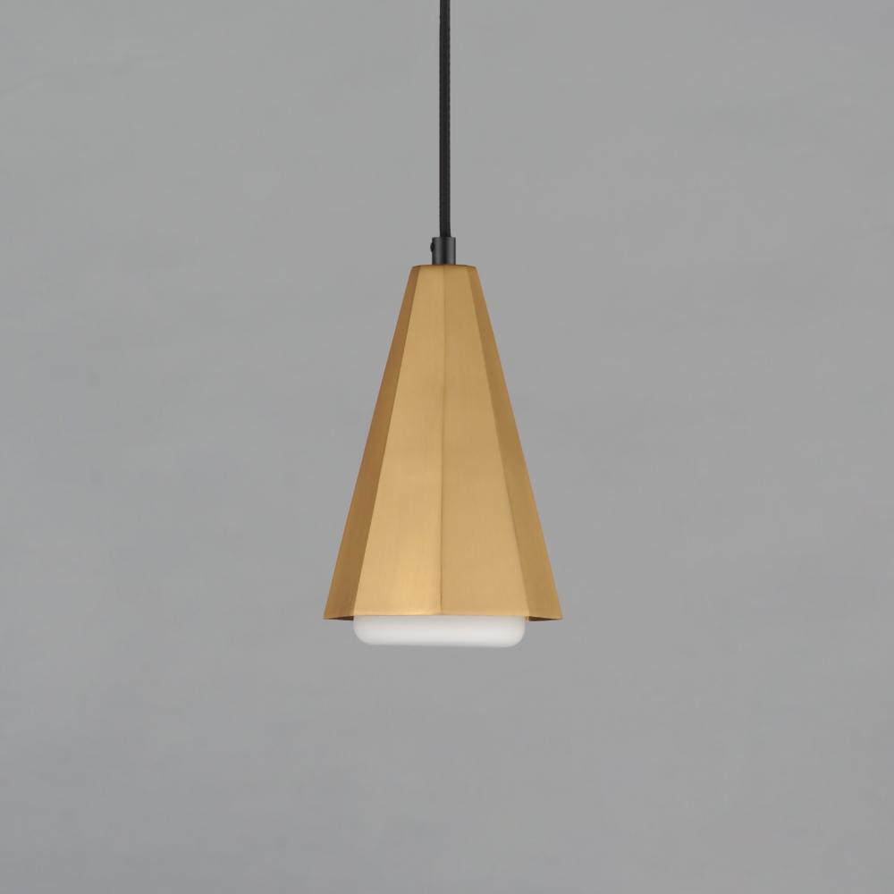 The Rizzo collection exudes stylish flair and spirited design, combining faceted metal shades in Natural Aged Brass with striking Matte Black accents. A flat-bottomed Satin White glass shade protrudes gracefully from the base of each metal shade, deliverin