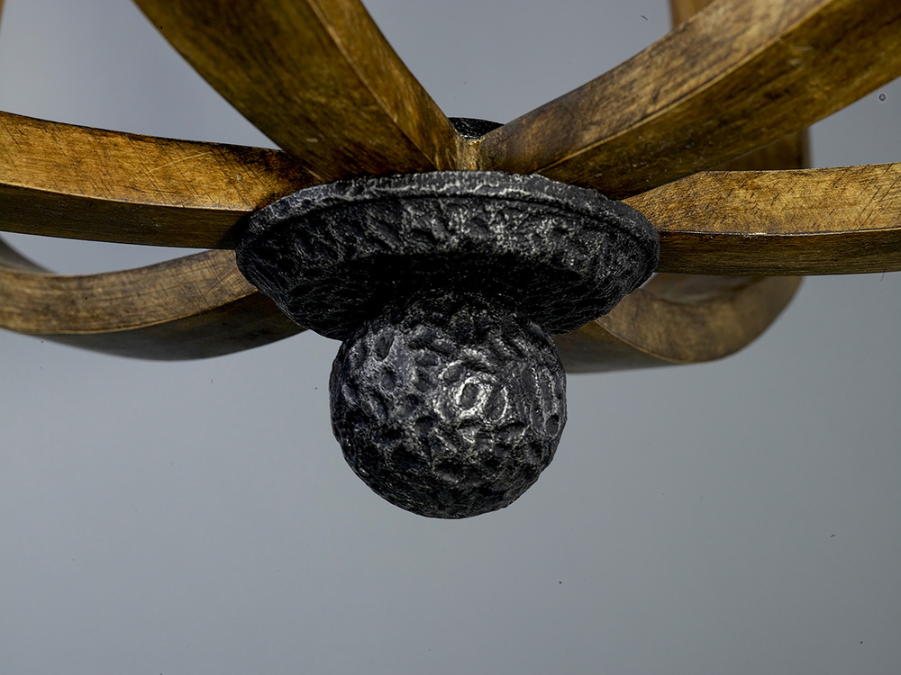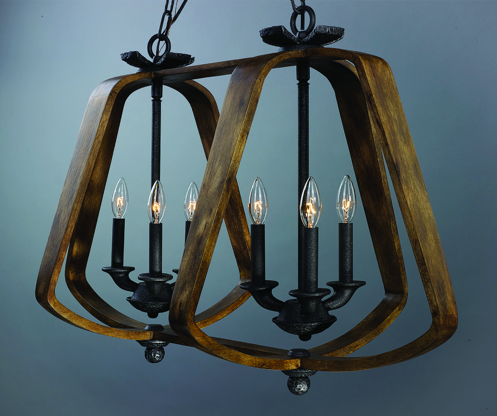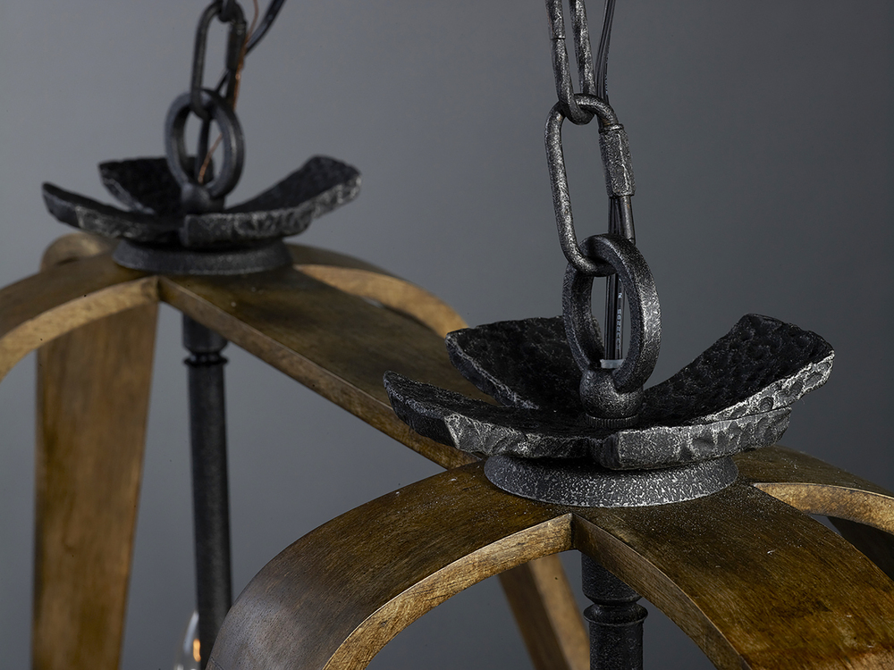 Unique pendants formed of bent wood finished in Barnwood which is a weathered and distressed look. The internal clusters and details are constructed of cast iron in a hammered pattern and finished in a natural looking Iron Ore. A excellent blend of soft