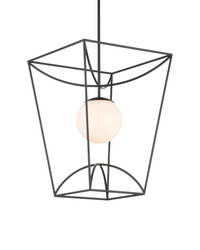 The Rochefort Medium Lantern is an outdoor pendant with beautiful lines that subtly draw themselves into a lantern-like form. The black powder-coated finish makes it durable for exterior environments and contrasts the milky white glass globe that it balances in its center. Whereas traditional lanterns may be limited to time-honored and transitional design aesthetics, the delicacy of this black lantern’s profile makes it fitting for mid-century modern homes and those that lean contemporary. Adjustable from 29.75" to 71.75" with use of included chain/rod kit/cable. If your space calls for a longer drop, additional chain/rods/cable is available for purchase.
