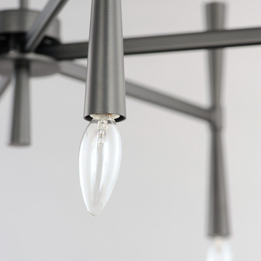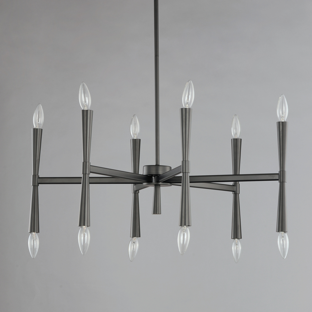 Civic styling using straight rectilinear channels radiating from a central connector. The light sources flare out both up and down with tapered candle covers creating a form evocative of a classic torch. Available in matte Black, Satin Brass, and Satin Nic
