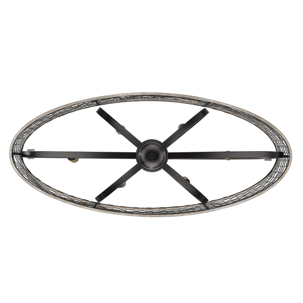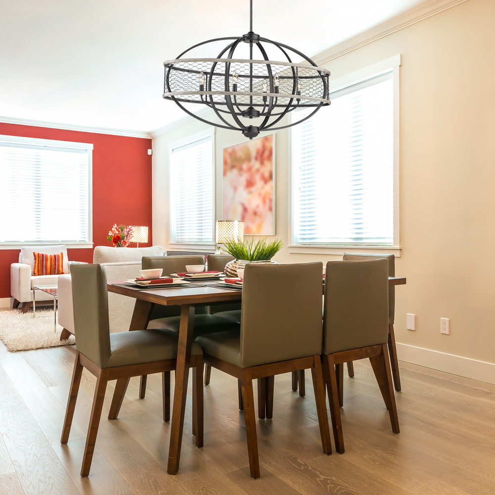 Chicken wire shade with hand-painted faux wood finish brings a casual, rustic feel to the design