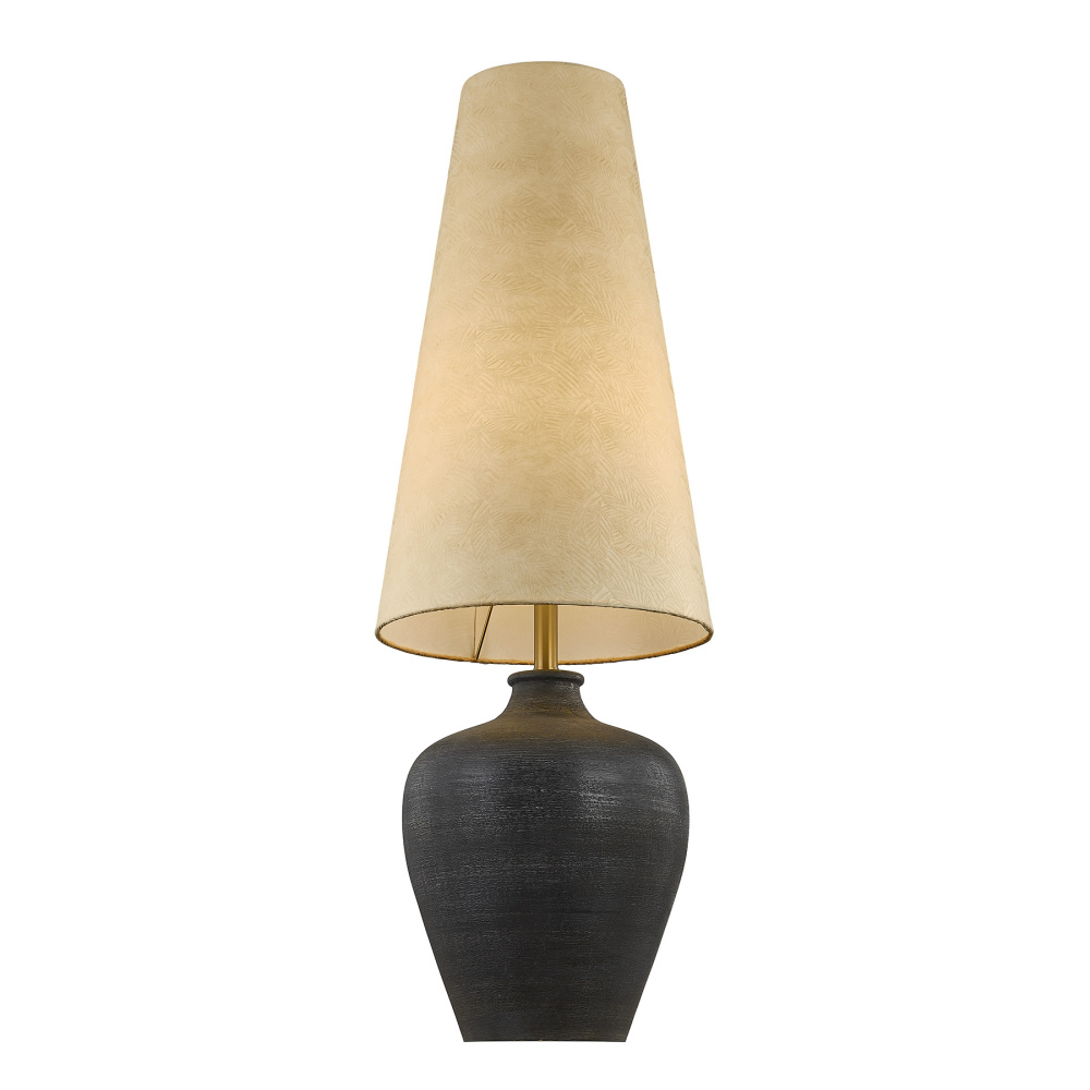 The Savoy House Rory 1-light table lamp was designed by award-winning interior designer and TV host Breegan Jane. This sizable lamp brings a big dose of style to any space! It starts with the dark ceramic urn-shaped body, which is finished with raised detailing that invites a closer look and topped by a paper shade embossed with a subtle, textured leaf motif. A Warm Brass finish on the hardware adds to the vibe. Rory is 40.5" in height and 14" in width. It uses one standard size bulb of up to 100 watts. Bulb not included.
