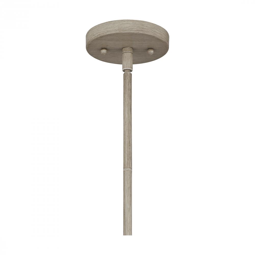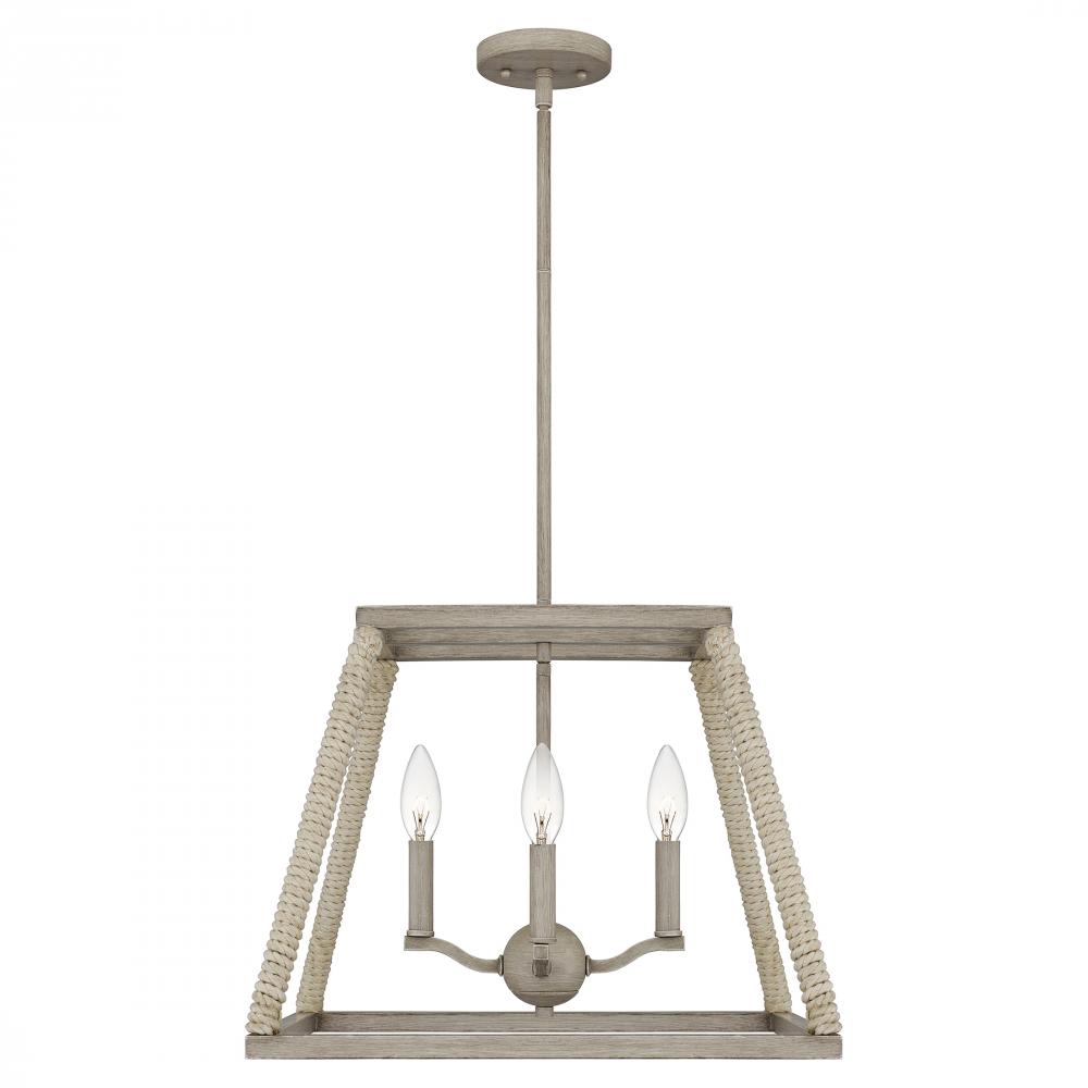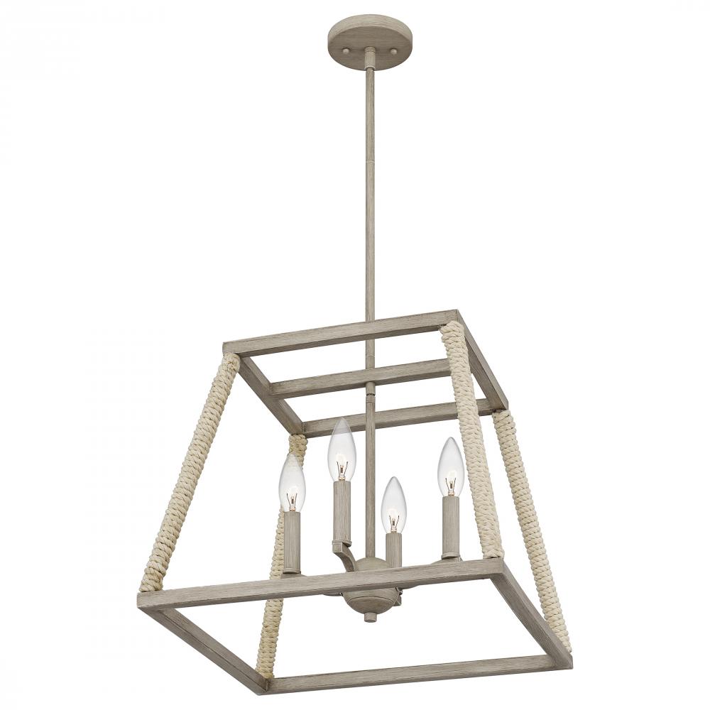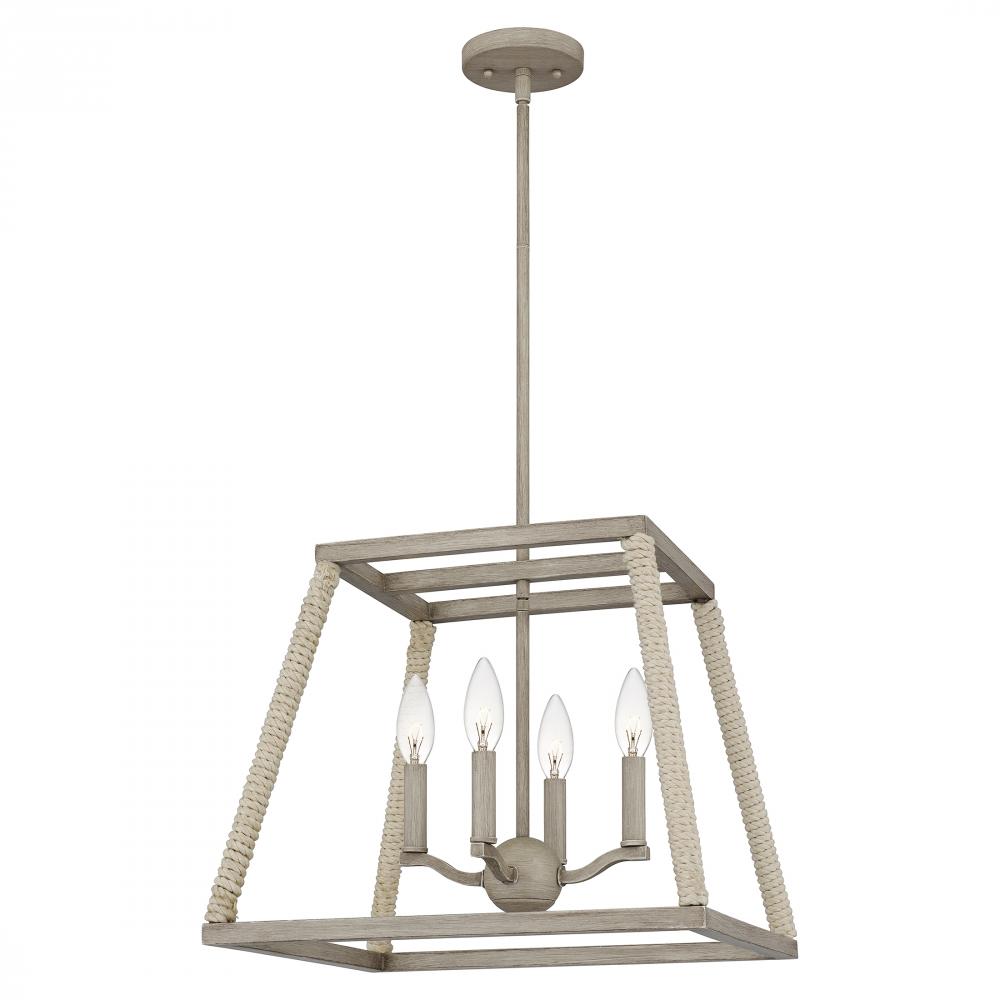 Crafted from gray washed oak, the Rosalind pendant embodies casual coastal style. Wrapped rope accents add artisanal charm to its open silhouette. Complete the look with four candle-style lights, guaranteed to warm up a dining or living room.