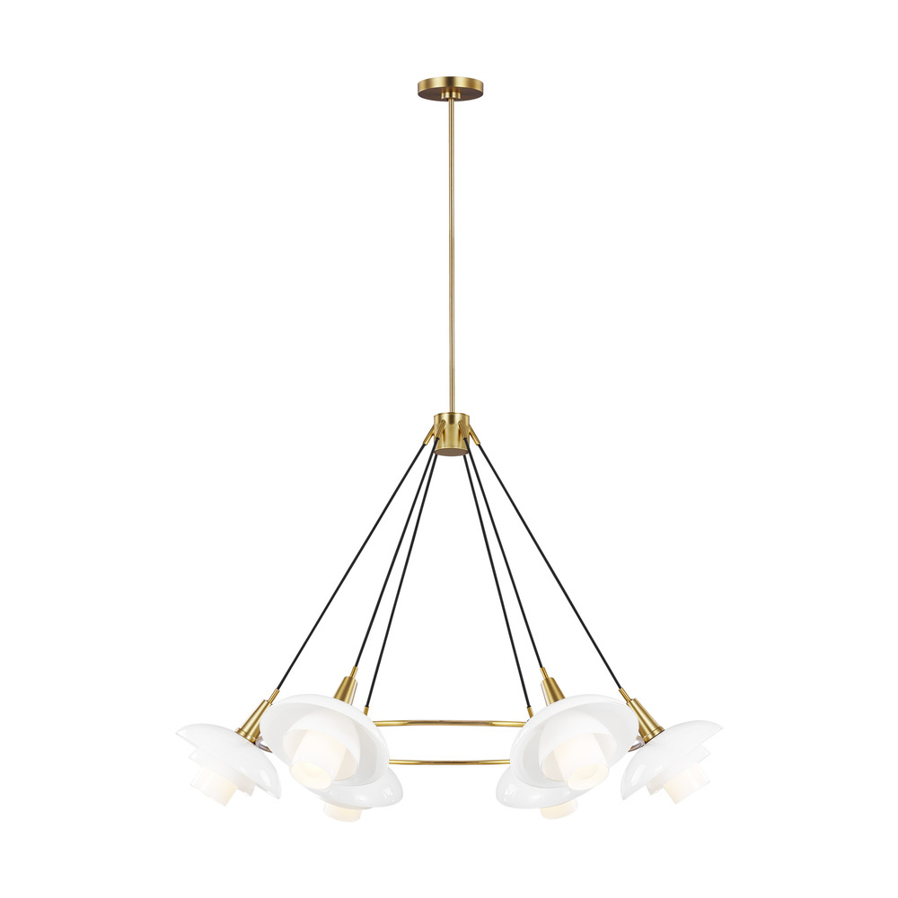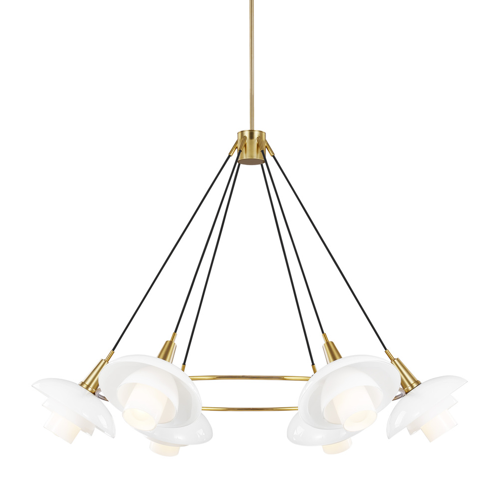 The Rossie six light single tier chandelier in Burnished Brass from Ellen DeGeneres features hand blown stacked individual layered milk glass shade, creating a sleek look that is both stylish and functional. The table lamp has a metal cascading shade with its light source completely invisible, because it is hidden within the shade. The light is diffused through the opal glass lampshades, which are arranged in a logarithmic spiral.