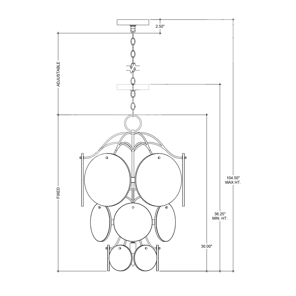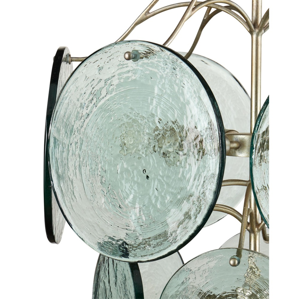 The Rovigo Chandelier has a flowing design created by the wrought iron frame to which discs of recycled glass are attached. The silver leaf finish and the textural mottled glass gleam when the lights are switched on. The silver chandelier has a contemporary feel thanks to the uniform shapes and clean edges of the discs that graduate from larger to smaller as they flow toward the bottom of the fixture. Adjustable from 36.5" to 104.5" with use of included chain/rod kit/cable. If your space calls for a longer drop, additional chain/rods/cable is available for purchase.