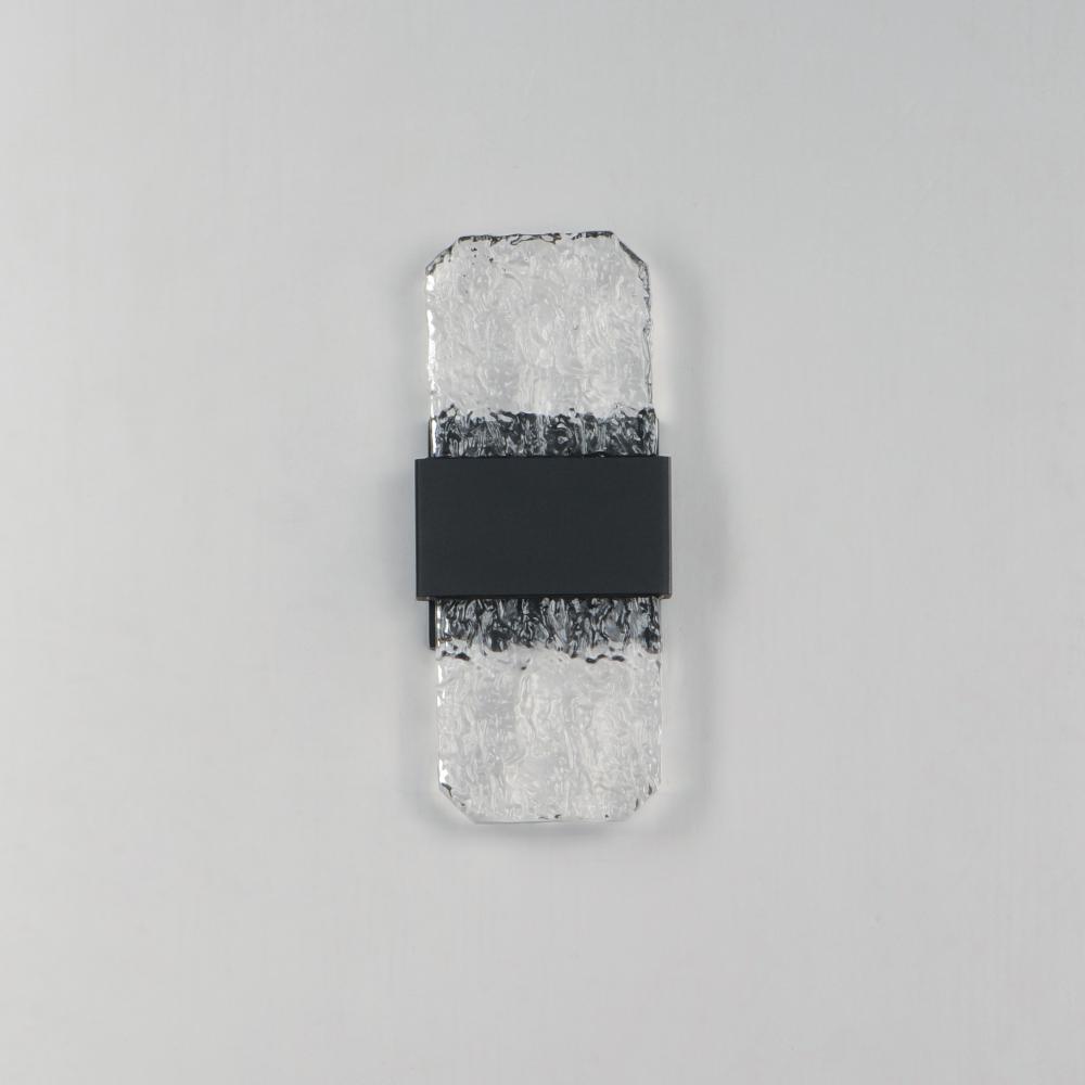 Artisanal cast glass slabs are supported by a Die Cast Aluminum bracket finished in an outdoor rated Black powder coat. Emphasizing the unique beauty of the glasses' imperfect contours, the sconces accentuate these features with concealed LED lighting.