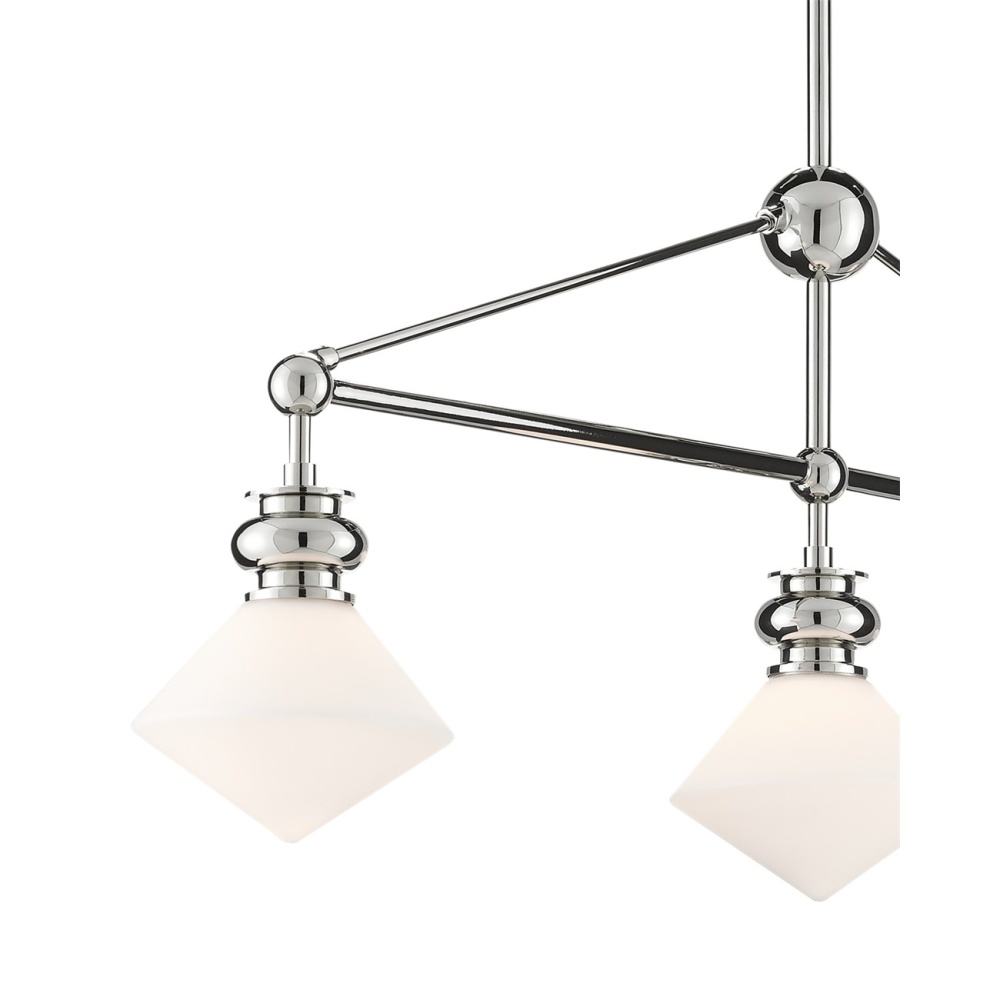 The Rycroft Rectangular Chandelier is a smart choice when a tailored design element is desired. The pointy rhombus-like shades, made of opaque glass, were inspired by a spinning top. This silver chandelier features a polished nickel finish on the metal. Adjustable from 24.5" to 60.5" with use of included chain/rod kit/cable. If your space calls for a longer drop, additional chain/rods/cable is available for purchase.