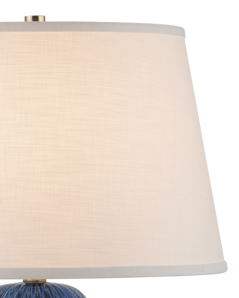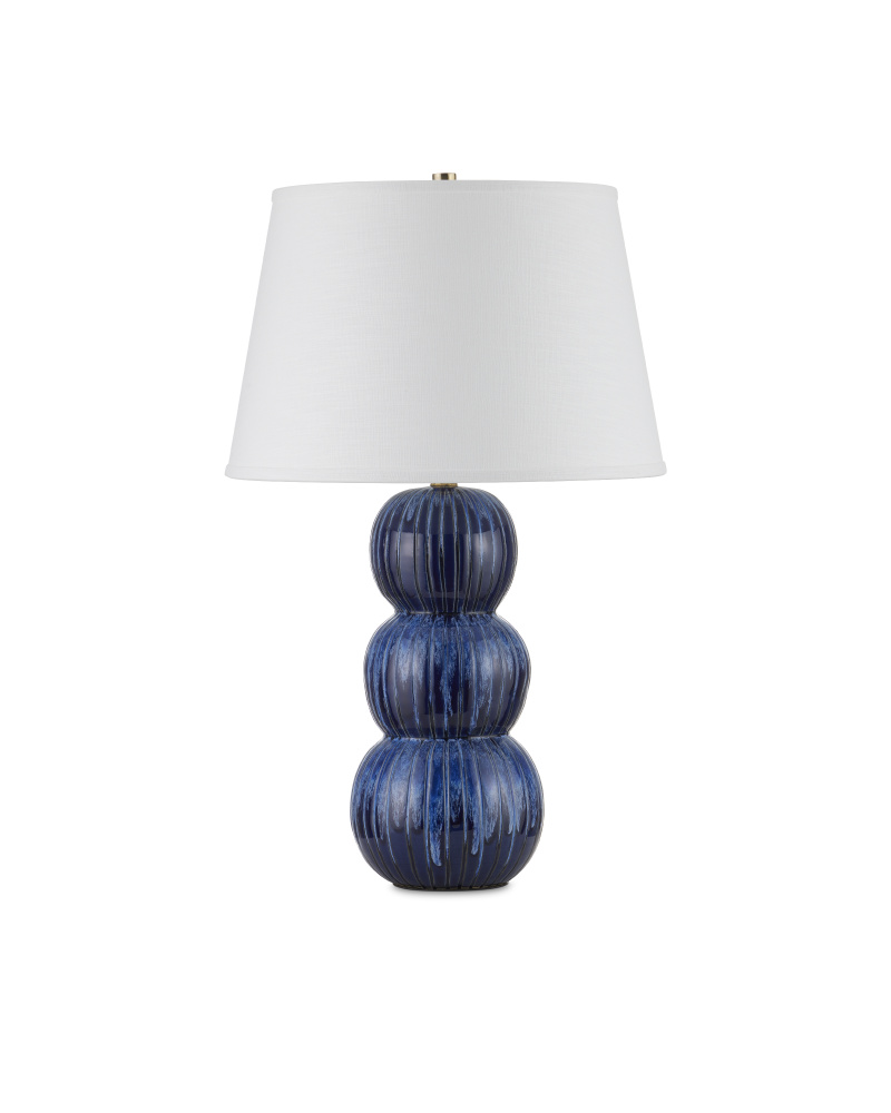 The Salacia Table Lamp has a stacked-globe body that drips with a mix of dark and bright blue glazes flowing down each striated orb in varying degrees of brightness. The painstaking attention to detail that is required to create such a varied but balanced glazing is achieved by a talented group of women artisans who live at the border of Burma and Thailand. The trim on the shade brings this navy blue lamp an uptick in sophistication.