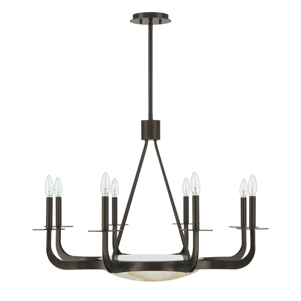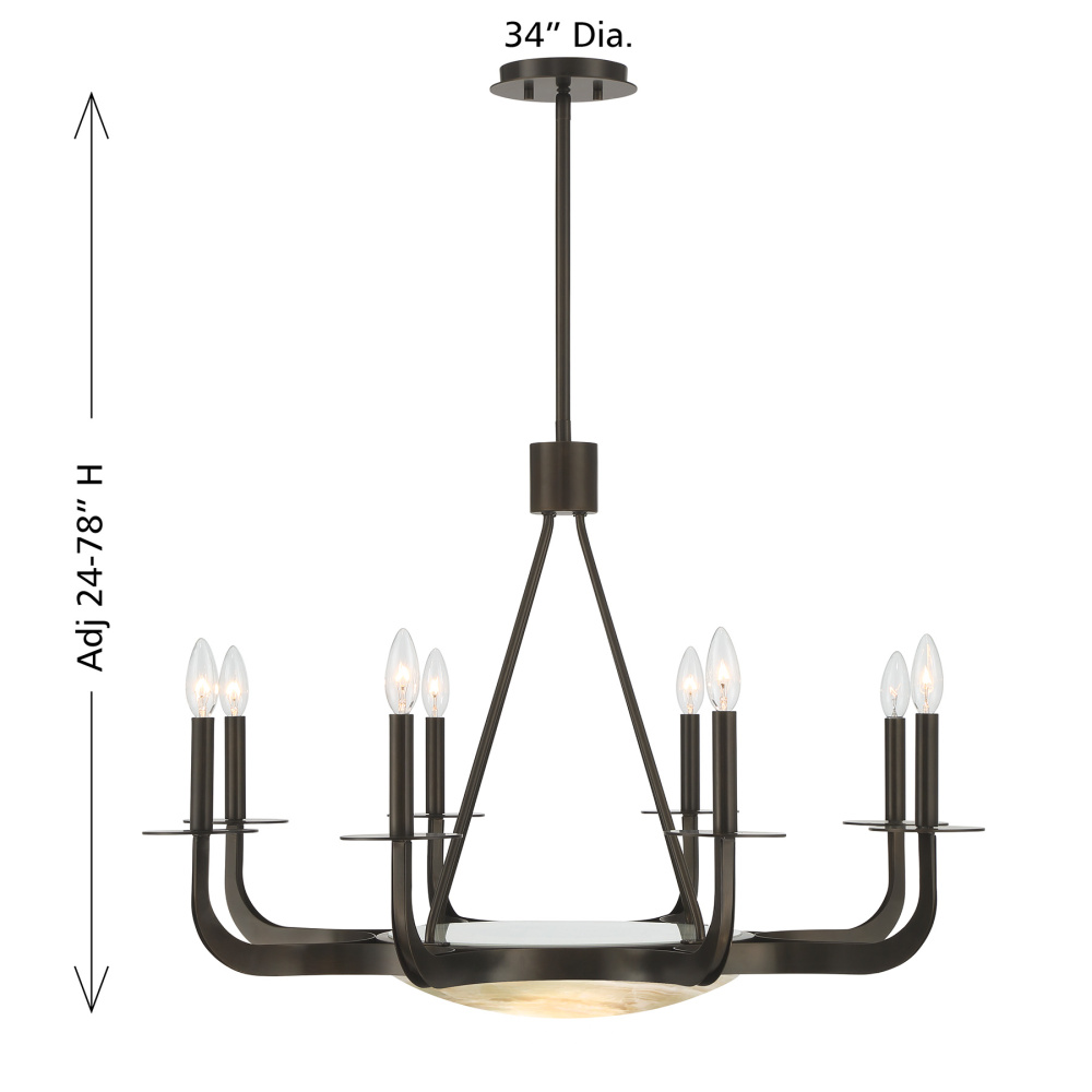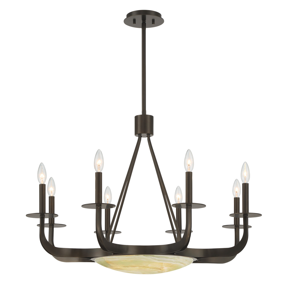 The Savoy House Salford 9-light chandelier was created by Dann Foley, an award-winning interior designer with a reputation for sophisticated, timeless style. Boldly curving arms carry eight candelabra lights while an LED downlight glows softly inside a dome crafted from beautiful natural onyx. The Mediterranean Bronze finish enhances the stone’s warm, earthy character. Salford is 34" wide and has an adjustable height ranging from 24" to 78". It uses eight candelabra size bulbs of up to 60 watts per bulb. Bulbs not included. Comes with four 12" downrods and one 6" downrod.