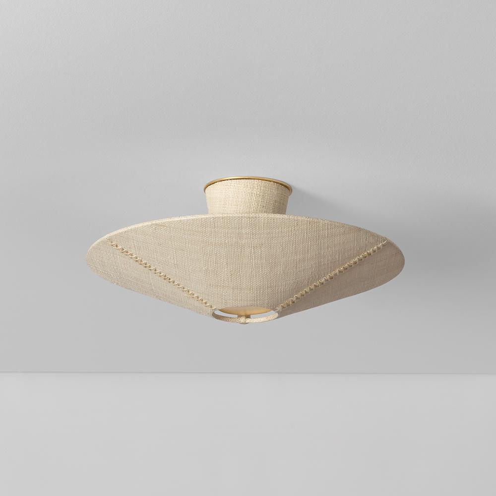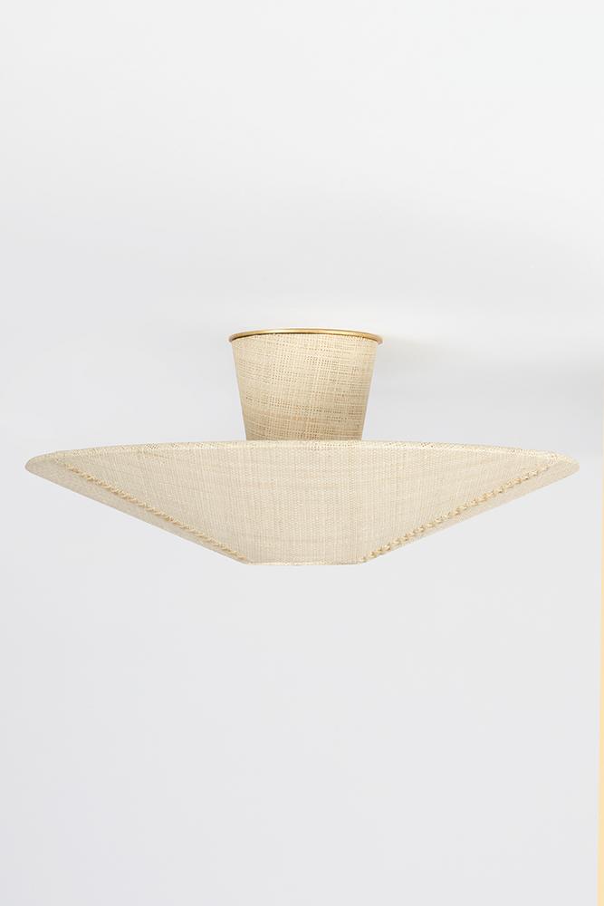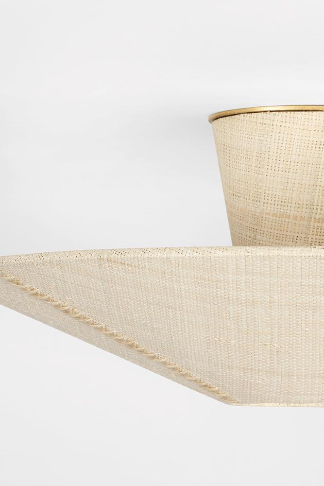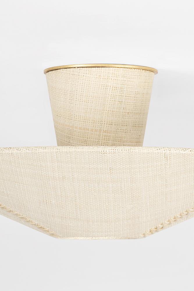 Salisbury Mills tells a natural material story that adds instant freshness to a coastal or bohemian space. Woven from Saguran Fabric, the shade serves as a gentle diffuser. The canopy and lower plate of this artisanal semi flush mount are finished in Gold Leaf, adding a luxe note. Due to the one-of-a-kind nature of the medium, exact colors and patterns may vary slightly from the image shown.