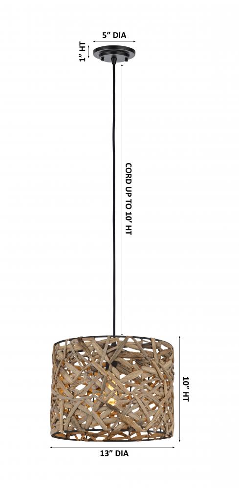 Drum pendant with unique woven matieral strands. Each of these natural pendants are unique in both design and may have slight vaiationg in color throoughout.