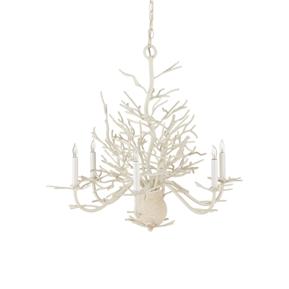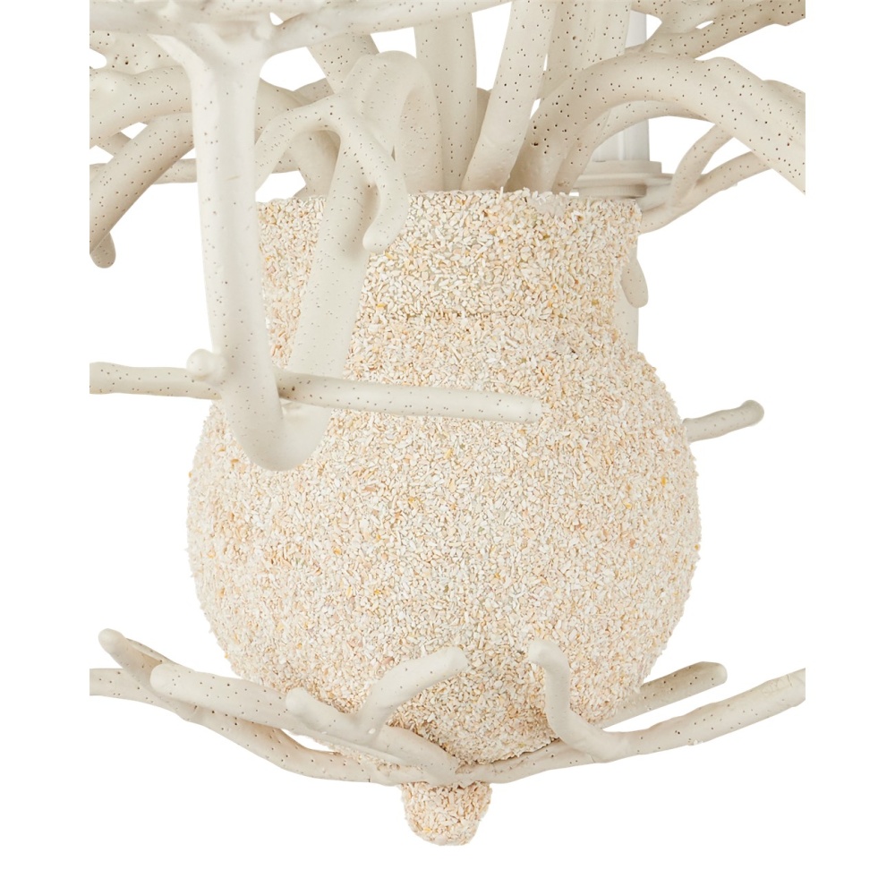 As enigmatically lovely as a coral reef, this small version of the Seaward Chandelier brings the feel of the world’s great oceans into a space with its masterfully executed tribute to the deep. Wrought iron, which is beautifully sculpted to resemble white coral, is covered in an application of sand that completes the mysterious transformation from metal to marine skeleton. This lovely six-light chandelier is anchored at the bottom by a textural pot from which its arms of coral richly extend. We also offer the Seaward in a larger chandelier and in a wall sconce.