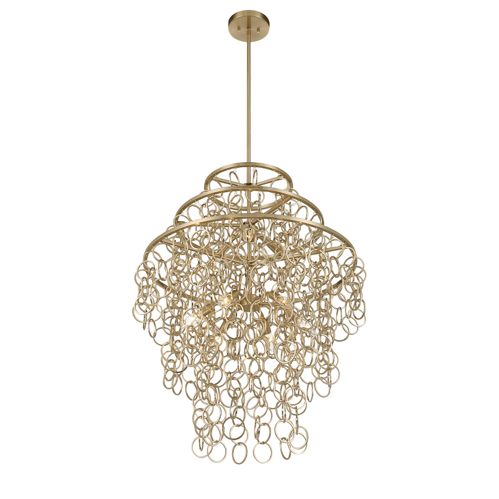 Designed by award-winning interior designer and TV host Breegan Jane, the Savoy House Setentas 9-light pendant brings seventies glamour into the modern era. Cascading strands of round chain shimmer in three luxurious tiers, all finished in radiant Noble Brass. The effect is a glowing waterfall of metallic texture - bold, playful, and irresistibly stylish. Setentas is 28" wide and offers an adjustable height from 34" to 88". It uses nine candelabra size bulbs of up to 60 watts per bulb (not included) and comes with four 12" downrods and one 6" downrod. This dramatic pendant turns any space into a showcase of personality and designer-driven elegance.