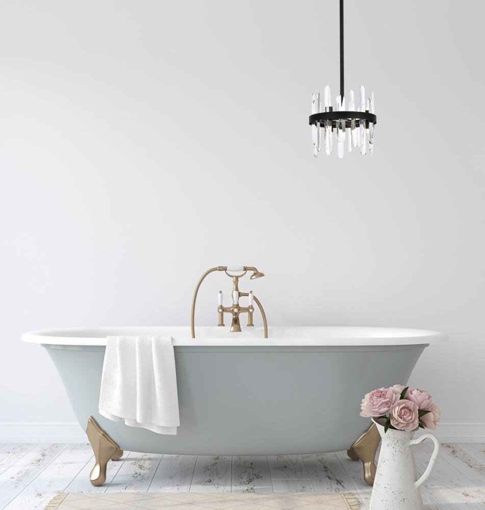 Modern crystal chandelier features top and bottom tier crystal prisms staggered along the wrought iron frame. The thick metal frame wraps around top grade crystal prisms ensure it is built to last, definitely worth it. Hang this work of art and dim the lights for a bit of sophisticated lighting in your home. Get lost in a beautiful light and sleek design available in multiple finishes. The hanging rod conveniently comes with a slope ceiling adapter, perfect for your vaulted or angled ceiling.