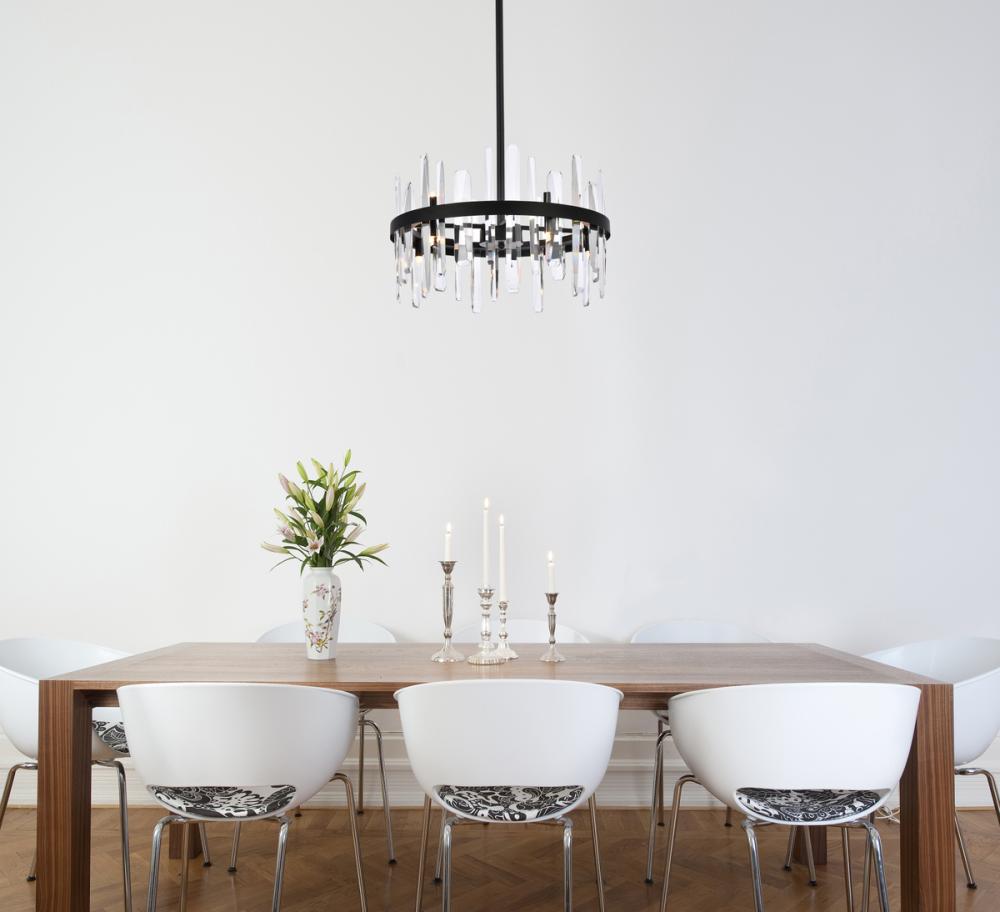 Modern crystal chandelier features top and bottom tier crystal prisms staggered along the wrought iron frame. The thick metal frame wraps around top grade crystal prisms ensure it is built to last, definitely worth it. Hang this work of art and dim the lights for a bit of sophisticated lighting in your home. Get lost in a beautiful light and sleek design available in multiple finishes. The hanging rod conveniently comes with a slope ceiling adapter, perfect for your vaulted or angled ceiling.