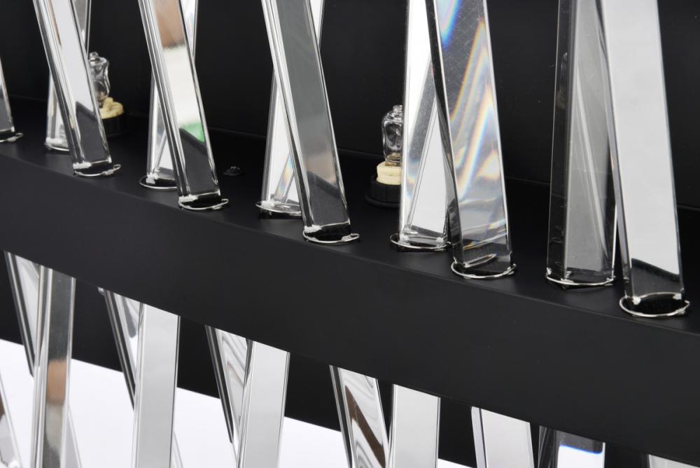 Rows of clear staggered glass rods embedded into the thick iron frame