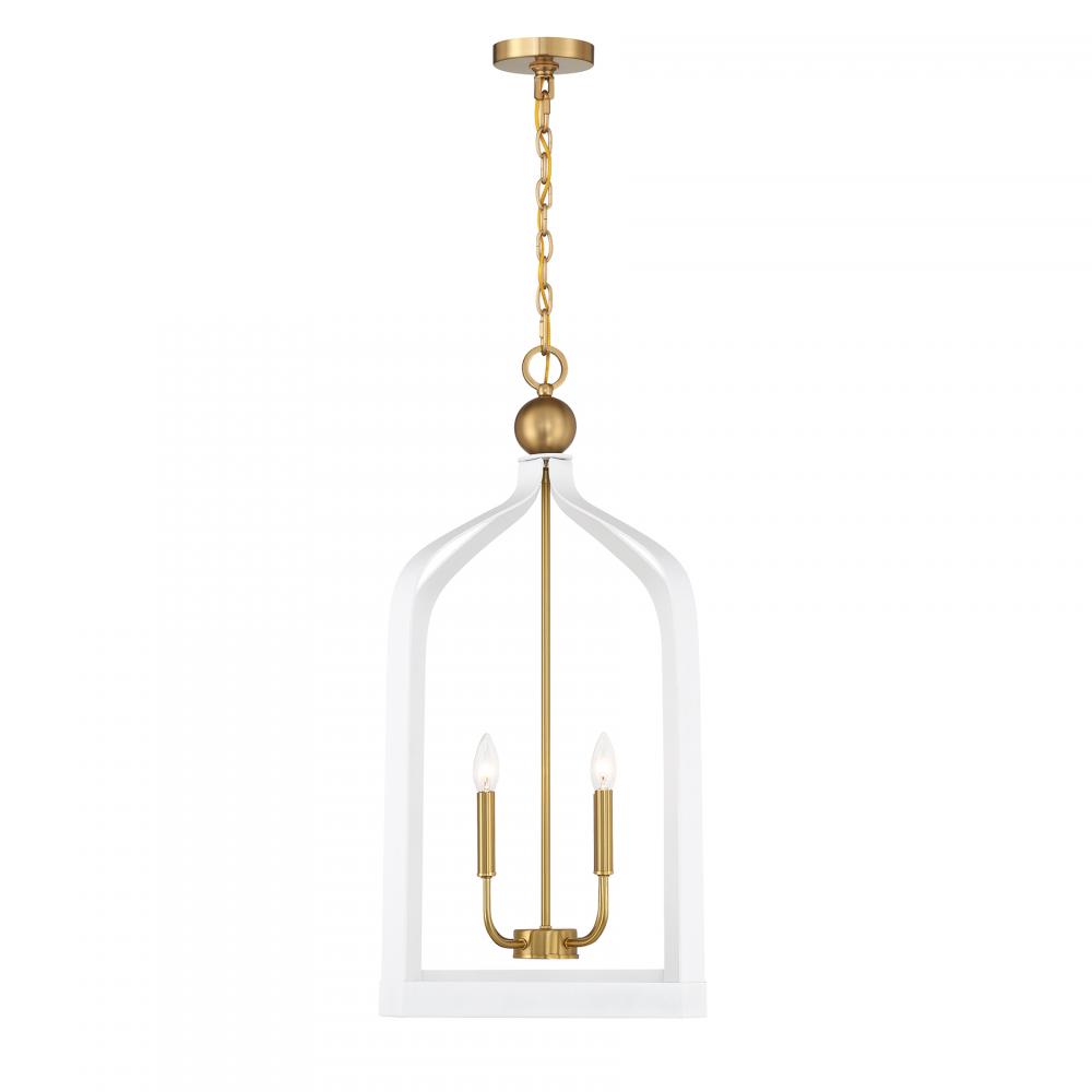 The Savoy House Sheffield 4-light pendant offers up a beautiful, elegant and classic look with a lantern-like style, airy openness and a White finish with Warm Brass accents. It is 32" in height and 15" in width. It uses four candelabra size bulbs of up to 60 watts per bulb. Bulbs not included.
