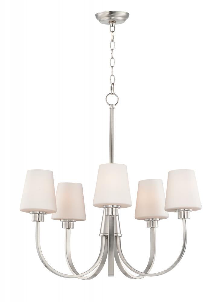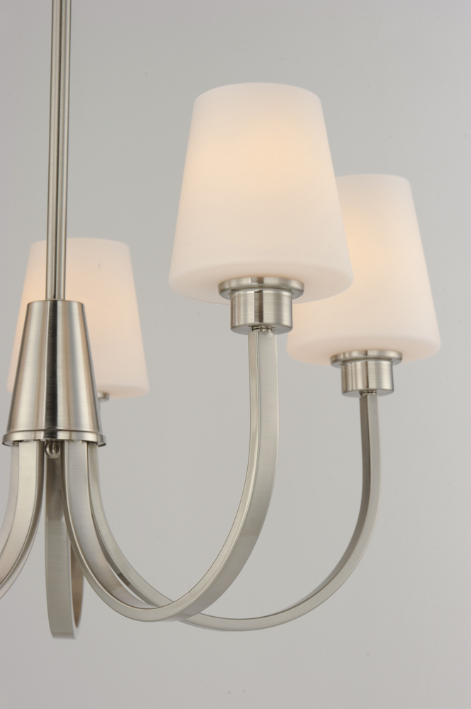 Graceful arcs of rectangular tubing transition to round cups that support tapered Satin White glass shades creating a crisp and clean transitional design. The frame is finished in your choice of Satin Nickel or Black which bridges modern and transitional d