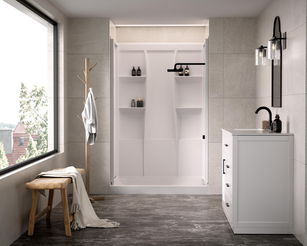 Upgrade your shower space with a sleek, functional, and easy-to-install three-piece acrylic shower wall surround that blends modern design with practical convenience. Featuring four built-in shelves, this surround ensures you always have space to keep shampoos, soaps, and essentials neatly stored. Designed for hassle-free installation, this unit features a direct-to-stud mounting system with built-in nailing flanges, ensuring a secure and lasting connection to the wall. The caulkless construction reduces the risk of leaks, providing peace of mind and long-term durability. With a bright white, high-gloss acrylic finish, this shower surround offers a modern, polished look that resists stains and is incredibly easy to clean. Unlike fiberglass-backed alternatives, the smooth, lightweight material is easy to handle and install without irritation. Whether you’re completing a full renovation or a quick upgrade, this shower surround effortlessly enhances the functionality and aesthetic of any bathroom spac