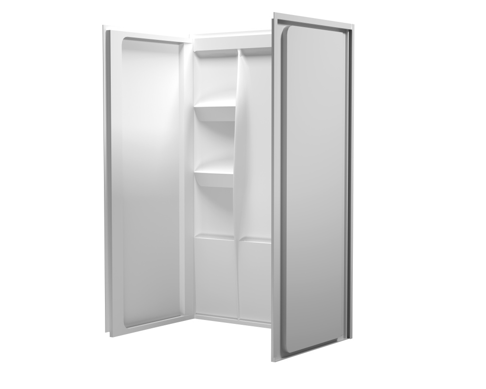 This three-piece acrylic shower wall surround offers built-in shelving for a clutter-free, organized bathing experience.